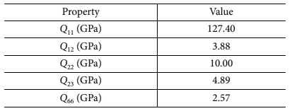 구조물의 두께가 길이, 폭에 비하여 매우 작을 경우 복합재료를 횡 등방성재료로 가정해 유효 강성 매트릭스인 식 (12)로 표현한다. 식 (12)의 각 항은 아래 식 (13)에서 (17)까지 5개의 독립적인 항으로 구성되며, 각 항의 분모는 식 (18)과 같이 정의된다.