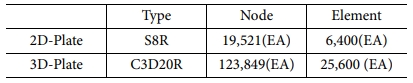본 연구에서는 3-D 점탄성 모델 해석 기법을 사용하여 선행연구의 열팽창계수와 마찰계수를 동일하게 설정하여 스프링 인 거동의 차이를 비교했다. 해석 모델은 1 ply당 0.2(mm), 적층배열 [0°/90°/45°/-45°]s로 적용했고, 3D L-형상으로 Fig. 10와 같다. 해석에 사용된 요소 타입은 C3D8I, 요소 개수는 총 89,440개 사용했다.