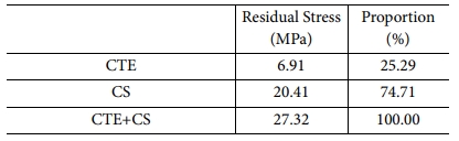 Table 4에 최종잔류응력의 결과를 나타냈다. 열팽창과 화학 수축을 동시에 고려한 모델의 최종잔류응력은 27.32(MPa)이며, 열팽창을 고려한 모델은 6.91(MPa), 화학 수축을 고려한 모델은 20.41(MPa)이다. 화학 수축을 고려한 모델이 열팽창과 화학 수축을 동시에 고려한 모델의 최종잔류응력의 74.71(%)만큼 차지하므로, 화학 수축에 의해 발생하는 잔류응력이 크다는 것을 알 수 있다. 경화도에 따라 변하는 수지의 화학 수축 거동은 서브루틴을 통해서 구현이 가능하다.