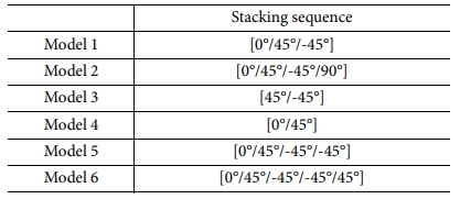 선행연구의 해석에서 사용한 복합재료는 본 연구에서 사용한 재료와 동일한 AS4/3501-6이며, 선행연구의 실험에서 사용한 복합재료는 P2352W-19이다. 해석 모델의 형상 정보는 Fig. 6과 같으며, 1 ply당 0.2(mm), 적층 배열은 Table 5와 같다.