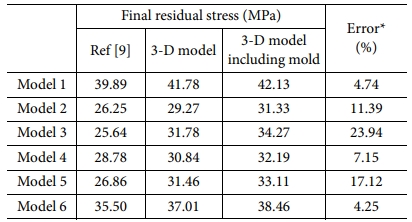 선행연구의 해석 모델과 몰드 고려 유무를 나눈 해석 모델에 대한 최종잔류응력 결과값은 Table 6에 나타냈다. 몰드를 고려하지 않은 모델의 최종잔류응력과 선행연구 해석 결과의 평균 오차율은 11.44(%)였으며, 몰드를 고려한 모델의 경우 고려하지 않은 모델보다 오차율이 더 높았다.