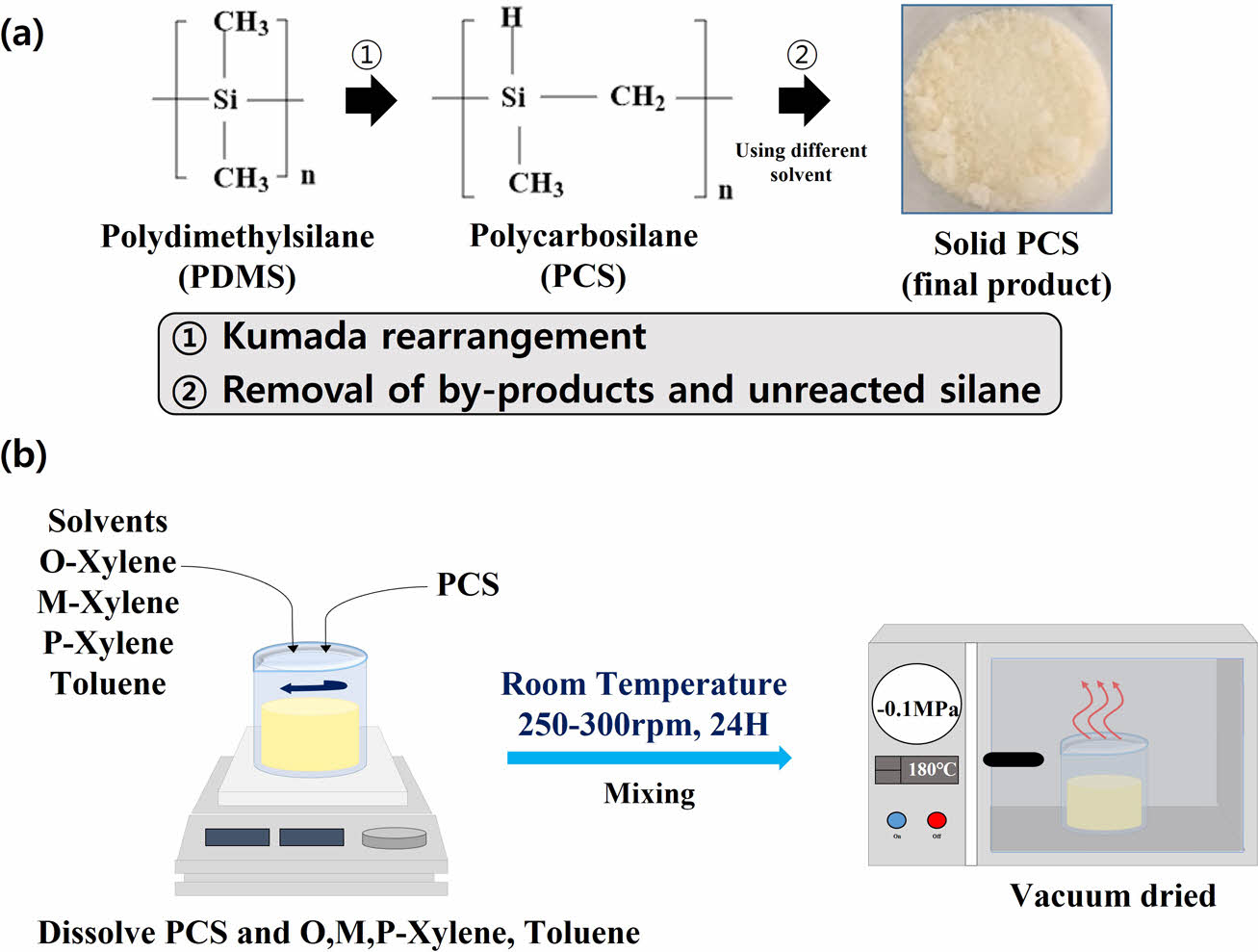 본 연구에서 사용한 폴리카보실란(Polycarbosilane, PCS, 투비엠테크(주)) (Mn~3850 g/mol, Melting point = 225oC)는 디메틸클로로실란(Dimethyldichlrosilane)으로부터 폴리디메틸실란(Polydimethylsilane)을 합성한 후 이를 폴리카보실란으로 전환하여 합성한 제품을 구매하여 사용하였다. 폴리카보실란을 Anhydrous Toluene (9.8%, Sigma Aldrich), o-Xylene (≥97%, Sigma Aldrich), m-Xylene (≥99%, Sigma Aldrich), p-Xylene (≥99%, Sigma Aldrich)의 각기 다른 용매에 용해한 후 열처리 건조를 통하여 정제된 폴리카보실란을 제조하였다. 폴리카보실란 용액은 용매 50 wt%의 중량비로 상온에서 24시간 교반 후, 180oC, 0.1 MPa 진공오븐 하에서 24시간 동안 건조하여 정제된 폴리카보실란 전구체를 제조하였다(Fig. 1). Toluene, o-Xylene, m-Xylene, p-Xylene에 용해된 폴리카보실란은 각각 T-PCS, O-OCS, M-PCS, P-PCS로 표기하였다.