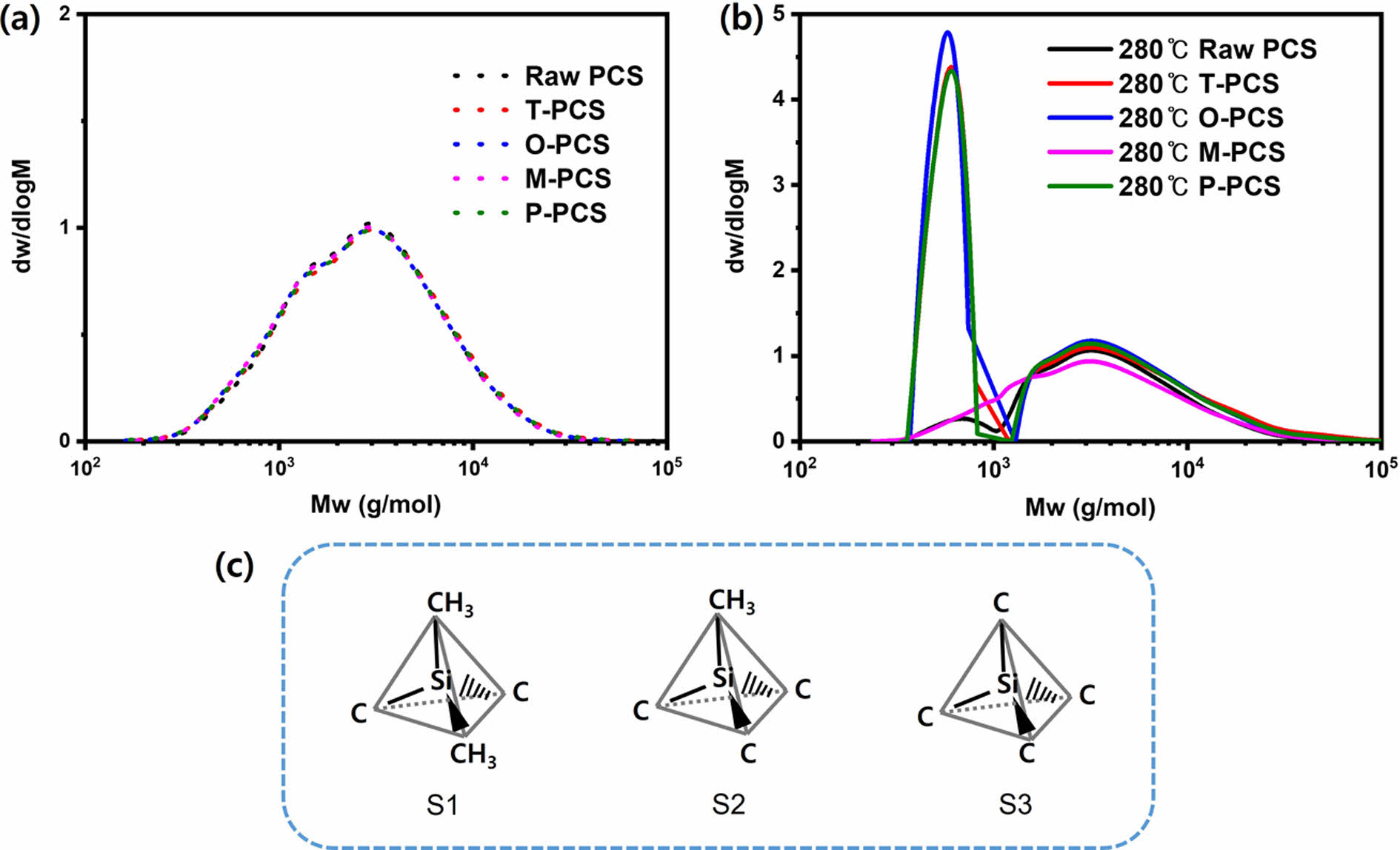 Fig. 2 GPC analysis results of various PCS presursors (a) before and (b) after heating at 280oC. (c) The postulated SiC structures |