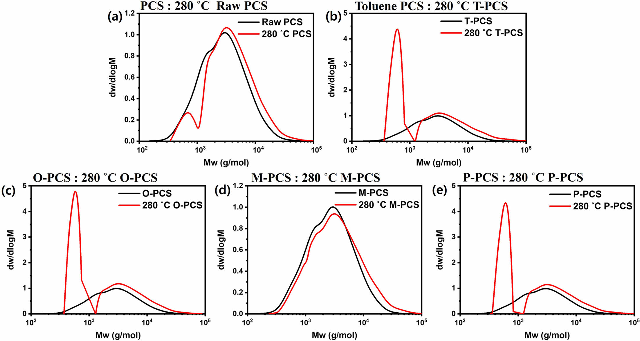 Fig. 3 A comparison of GPC results of various PCS presursors before and after heat treatment at 280oC: (a) Raw PCS, (b) T-PCS, (c) OPCS, (d) M-PCS, and (e) P-PCS |