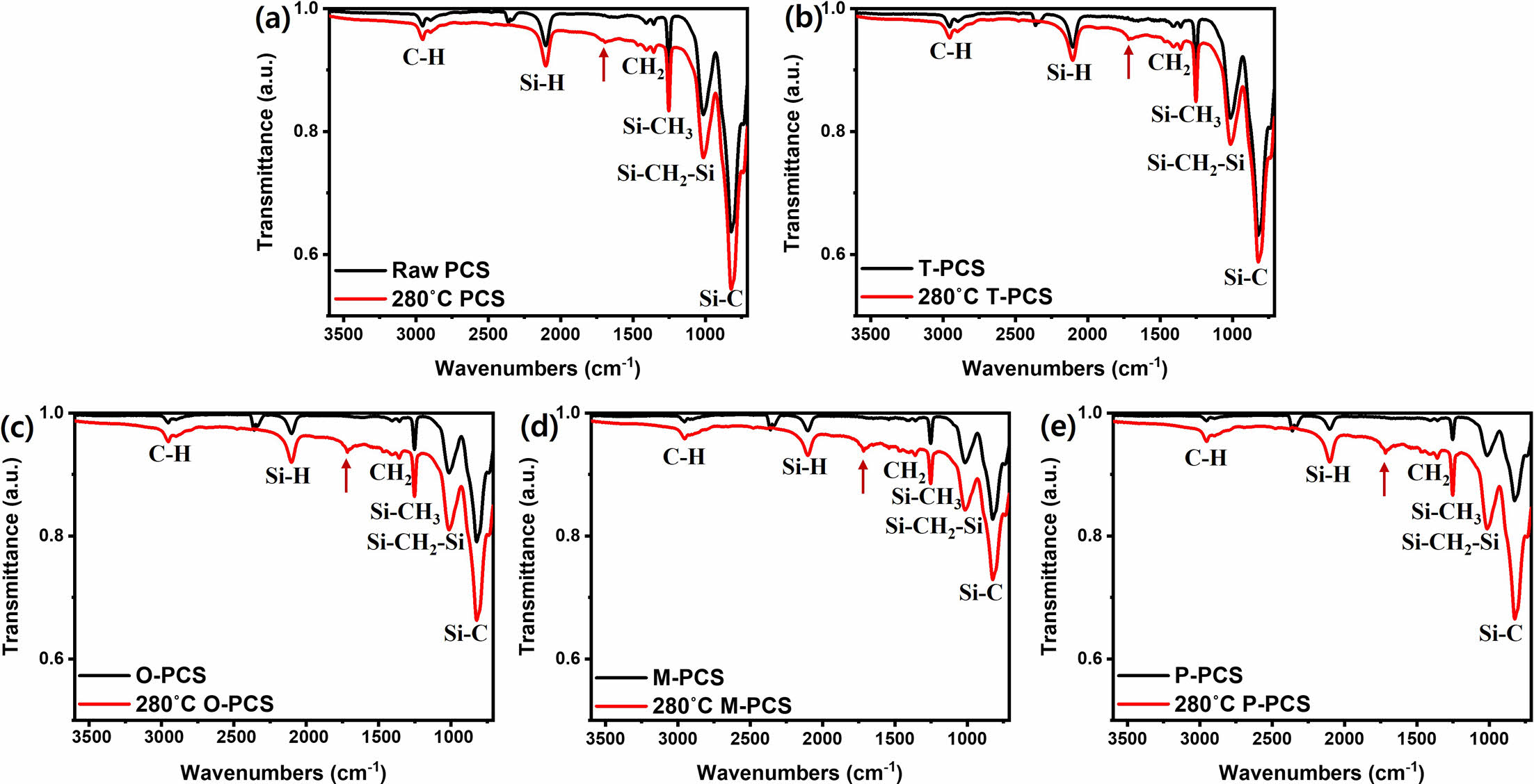 Fig. 4 FT-IR spectra of various PCS precursors before and after heat treatment at 280oC: (a) Raw PCS, (b) T-PCS, (c) O-PCS, (d) M-PCS, and (e) P-PCS |