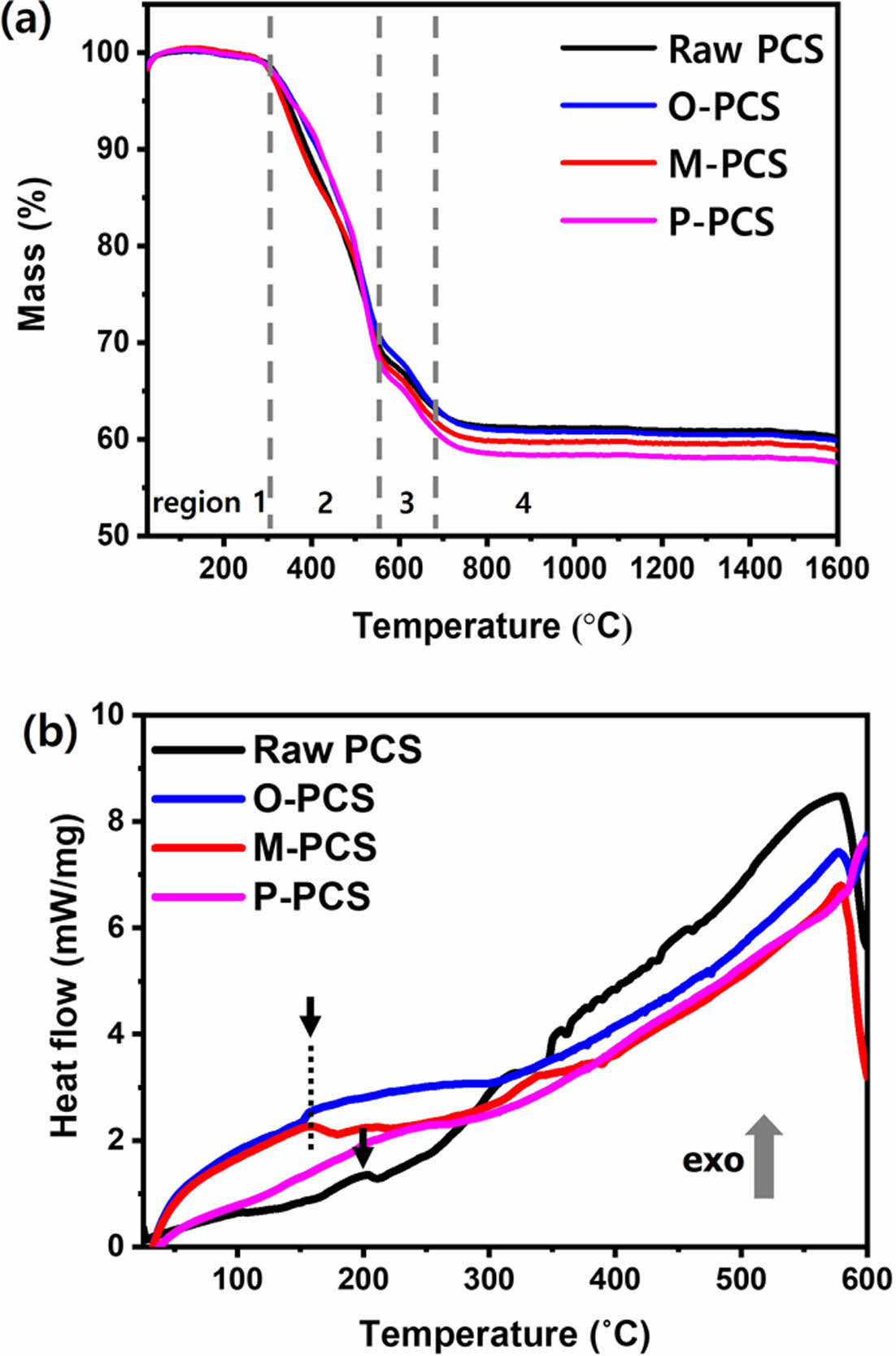 Fig. 5 (a) TGA and (b) DSC curves of various PCS precursors with a heating rate of 5oC/min |