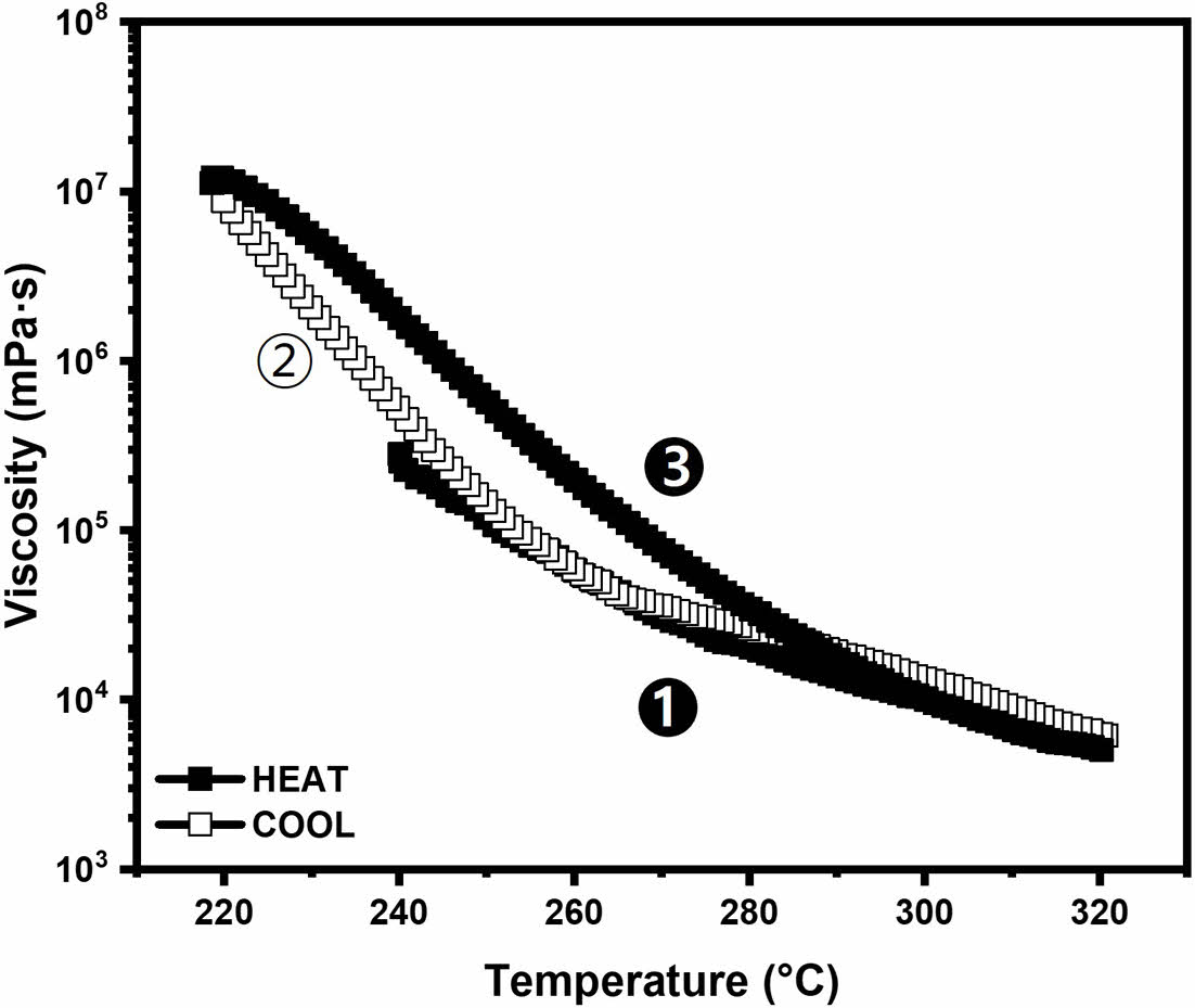 폴리카보실란 전구체의 온도에 따른 유변물성 측정은 회전형 레오미터(MCR-102, Anton Paar, Austria)를 사용하여 측정하였고, 모든 유변물성 측정 시 25 mm의 일회용 평판 플레이트를 이용하였다. 주파수 스윕(frequency sweep) 측정 시 변형률(strain)은 5% 로 선형 점탄성 번위 내로 고정하였으며, 각주파수(angular frequency) 범위는 1-628 rad/s 까지 측정하였다. 점도 측정 시에는 전단율(shear rate)을 1 l/s로 고정하여 측정하였다. 폴리카보실란 전구체는 공기중에 노출되면 굳기 때문에 모든 유변물성 측정은 질소 분위기에서 측정하였으며, 완전히 녹은 폴리카보실란 전구체의 유변물성을 측정하기 위해 240oC에서 충분히 녹여준 후 측정을 진행하였다. 측정 온도의 범위는 주파수 스윕 측정 시 240oC에서 280oC까지 10oC 간격으로 온도를 증가시키면서 측정하였고, 점도 측정 시에는 가열-냉각-가열(Heat-Cool-Heat) 사이클을 이용하여 240~320oC, 320~220oC, 220~320oC 순으로 온도 변화를 주어 측정하였다.