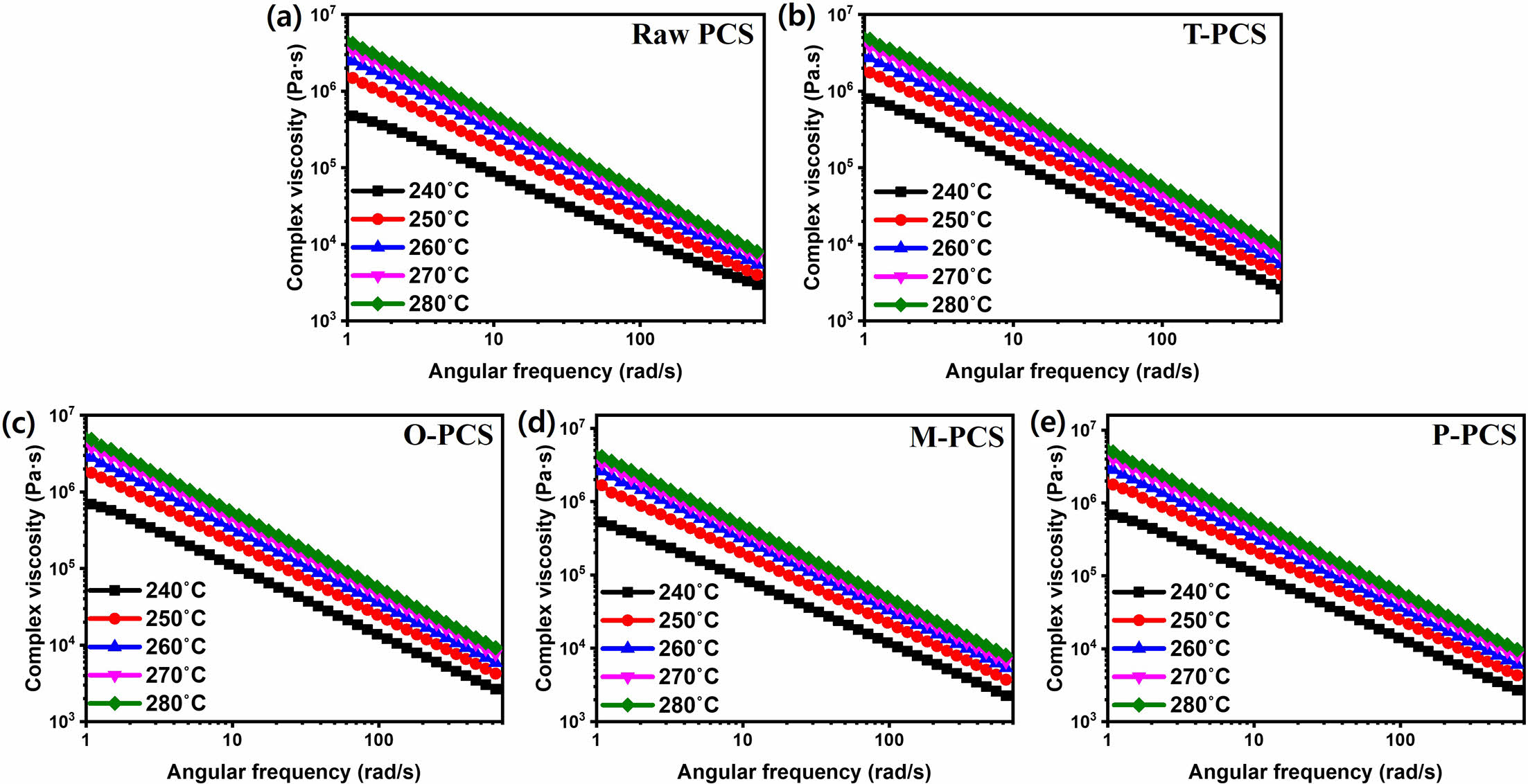 온도를 고정하고 각주파수를 변화하여 측정한 복합 점도 결과를 보면, 모든 시료에서 온도에 따라 복합 점도가 증가함을 알 수 있는데, 이는 탈수소화 반응에 의하여 추가적인 중합이 일어나는 것으로 해석할 수 있다. 즉, 고온 점도 측정을 통하여 점도 상승에 따른 시료의 탈수소화 반응 및 추가적인 중합을 간접적으로 알 수 있다. 저주파수 영역에서의 복합 점도를 비교한 경우, 용매처리하지 않은 폴리카보실란 전구체의 경우 점도 상승 효과가 가장 큰 것으로 보아, 탈수소화 반응에 의한 추가 중합이 가장 큰 것을 알 수 있다. 또한, 고주파수 영역에서의 복합 점도를 비교한 경우 용매처리하지 않은 폴리카보실란 전구체가 서로 다른 온도에서 점도의 편차가 제일 작은 것으로 보아, 구조적 재배열에 의한 네트워크 구조 효과가 다른 시료보다 적은 것을 알 수 있다. 이는 용매처리하지 않은 경우 전구체의 저분자량 정제가 제일 적게 이루어졌기 때문에 열역학적으로 안정한 상태의 효과적인 구조 재배열을 저해하기 때문인 것으로 해석된다.