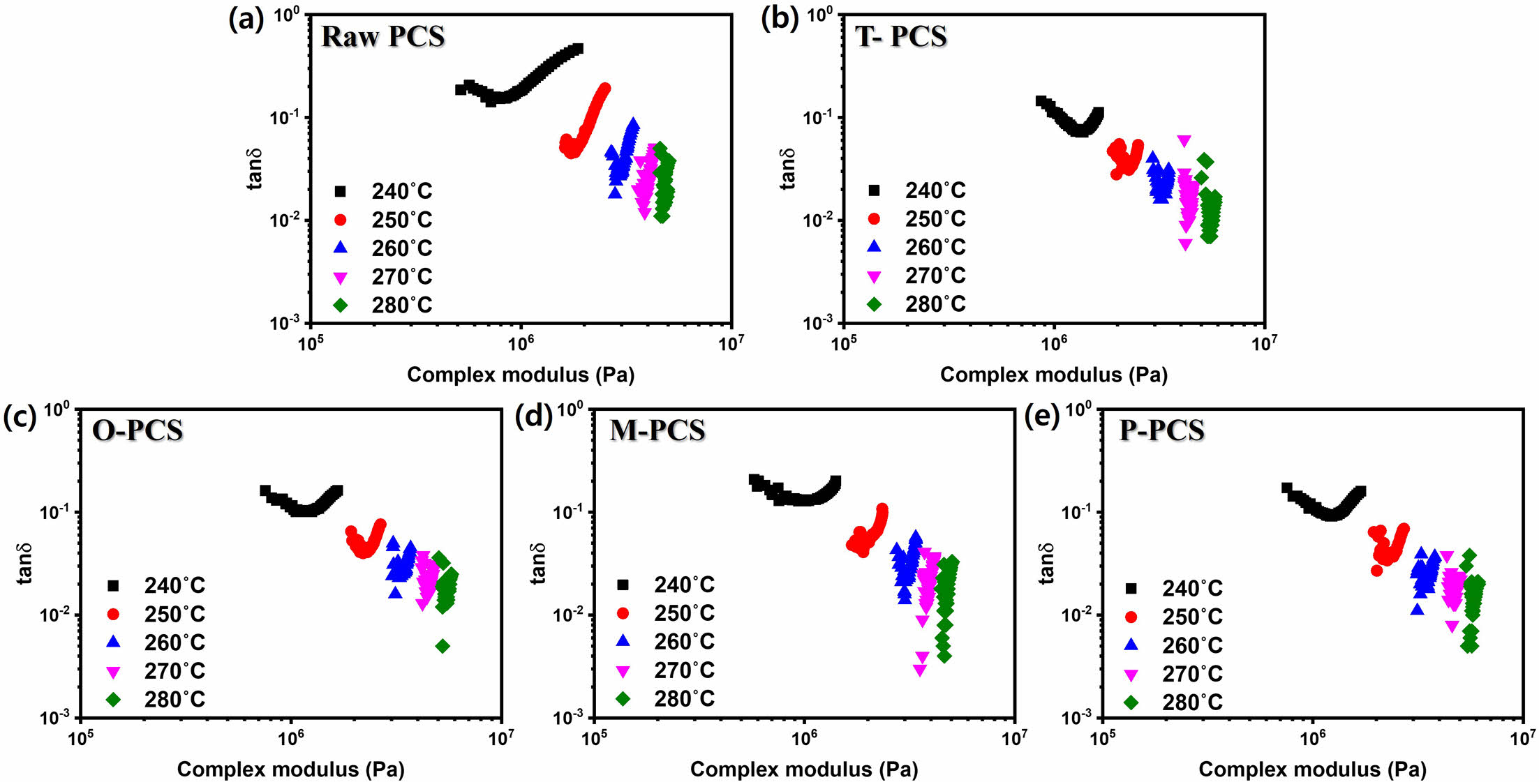 v.s. 위상차 δ)을 수행하였다. 완전 점성체의 위상차는 π/2 이고, 완전 탄성체의 위상차는 0으로 위상차가 작을수록 탄성체에 가까운 특성을 가지게 된다. vGP 분석값은 고분자의 분자량, 분자량 분포 및 분자 구조에 민감하게 변하는 것으로 보고되고 있다[15]. 결과에서 보면 고온으로 갈수록 위상차는 급격히 0에 가까워지는 것을 알 수 있으며, 특히 P-PCS의 경우 가장 좁은 복합탄성률 영역에서 큰 폭의 위상차 감소가 나타남을 알 수 있었다. 이를 통하여 P-PCS가 온도에 따라서 구조 재배열에 의한 네트워크 구조가 가장 효과적으로 일어남을 알 수 있다. 반면, 용매처리하지 않은 폴리카보실란 전구체의 경우 비교적 넓은 복합탄성율 영역에서 위상차 감소가 일어나고 위상차 감소폭도 제일 작은 것으로 보아, 고온에서의 용매 처리된 다른 폴리카보실란 전구체에 비하여 탄성 효과가 제일 작음을 알 수 있다. 선형 고분자에서는 위상차가 작아졌다가 제일 작은 값을 가지고 다시 상승하는 거동을 보이는데 폴리카보실란 전구체의 경우 낮은 온도에서는 모두 이러한 거동을 보이다가 높은 온도에서는 복합탄성률의 폭이 작아짐을 알 수 있다. 이와 같은 결과는 고온 시 선형 고분자에서의 네트워크 구조 효과에 기인한 것으로 해석된다. 결론적으로, 용매에 따른 미반응물 및 저분자량의 정제효과는 Toluene, o-Xylene, p-Xylene 용매가 가장 우수하며, 고온 시 추가적인 중합 및 네트워크 재배열에 따른 구조 효과 증가로 인해 P-PCS가 가장 우수한 네트워크 재배열 효과를 보이는 것을 알 수 있었다.