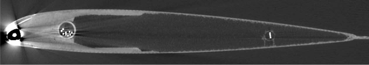 회전익 블레이드의 단면은 정적 강도 및 동적 특성을 만족하면서 적정수준의 무게조건을 만족하기 위해 정교한 과정을 거쳐 설계된다. Fig. 1은 HART II 블레이드의 CT 단면 사진[12]을 보인 것으로, 여기에는 외피(skin), 스파(spar), 보충재, 무게 추, 익형 뒷전의 탭(tab)등으로 구성되어 있다. 이 중 단면의 정적 및 동적 특성에 가장 큰 영향을 주는 구조물은 스킨과 스파이다. 가벼우면서도 큰 강성도를 가지기 위해 이들은 통상적으로 유리섬유와 탄소섬유와 같은 복합재료로 제작된다. 스파의 경우 가장 효율적인 형태를 위해 C-스파, D-스파와 같이 다양한 형태로 배치되어 단면의 복잡도를 증가시킨다. 이렇게 블레이드 해석 및 설계에 있어 복잡한 형태의 단면을 유한요소 모델링 하는 과정은 핵심요소이다.
