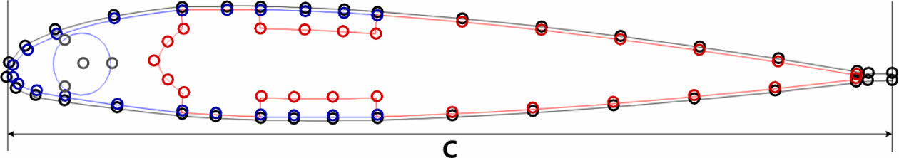 블레이드는 단면 모델링을 위해 먼저 2차원 유한요소 모델을 점들로 구현했다. 이어서 점 – 선 – 면의 단계를 밟아 전체 단면을 구축했다. 단면을 점으로 구현하는 첫 단계는 각 단면들의 최 외곽 점들의 정보를 확보하는 것이다. 이후 확보된 점들을 기반으로 구조물을 구성하는 점들을 배치한다. 구조물의 구현이 끝나면, 배치된 점들을 선으로 연결하여 단면을 구성한다. 이 과정에서 근사 곡선의 일종인 B-spline을 활용해 단면을 구성하는 곡선들을 생성한다. B-spline은 de Boor Cox 점화식[14]으로 대표되는 기저함수와 제어 점들 사이의 함수로 구성되는 근사곡선[15]이다. 이는 회전익 블레이드와 같이 여러 곡선들로 이루어진 단면을 2차원 유한요소모델로 생성하는데 있어서 효율적이다[16].