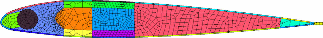 이상의 B-spline을 이용해 생성된 선들은 각 구조물들이 배치되는 영역에 맞게 면을 생성하게 된다. 이후 생성된 면을 2차원 유한요소로 분할하게 되며, 여기에 물성 값을 부여하여 모델링을 마무리한다. 이러한 과정은 상용 유한요소 모델 생성 프로그램인 Gmsh[17]를 이용하여 구성하였다. Fig. 2는 블레이드의 단면구조를 점과 곡선으로 구현한 모습을 보여주며, Fig. 3은 최종적으로 생성한 블레이드 단면 유한요소 모델이다. 이러한 모델링 과정을 통해 다양한 형태를 가진 단면의 유한요소모델을 생성하는 것이 가능하며, 여러 변수에 대한 단면의 모델링을 자동화하여 빠른 속도로 구현하도록 구성하였다.