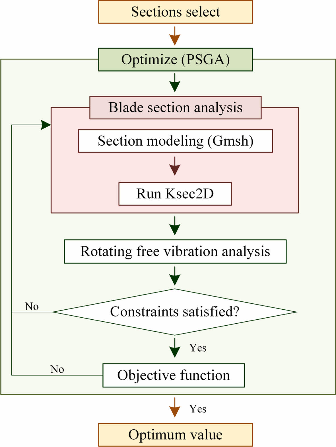 전역 탐색 기법인 PSGA와 단면의 2차원 유한요소 모델링, 그리고 동적 고유 진동 해석 프로그램을 결합하여 블레이드 전체의 최적 구조설계 프레임워크를 구성하였다. Fig. 4는 구성한 최적 설계 과정을 나타낸 것이며, 이는 최적화 전반을 담당하는 PSGA 모듈과 단면의 모델링 및 해석을 수행하는 모듈, 동적 진동 해석을 담당하는 모듈로 구성된다. 본 연구에서 사용한 PSGA는 입자 군집 최적화의 장점과 유전자 알고리즘의 장점을 결합한 기법이다. 기존의 유전자 알고리즘은 선택-교차-변이의 세가지 방법을 이용하여 최적화를 이어간다. 이 경우 빠른 속도로 전역에 대한 최적해를 구할 수 있다는 장점이 있다. 하지만 변수들의 분배 과정에서 값들이 편중될 수 있다는 위험성을 가지고 있다. 이러한 문제점을 입자 군집 최적화는 전역에 흩뿌려진 변수들을 각각의 방향으로 퍼트림으로써 개선했다. PSGA는 위와 같은 두 기법을 차용한 기법이다. 변수 재생성 과정에서 PSGA는 군집 알고리즘 모듈과 유전자 알고리즘 모듈을 모두 사용한다. 두가지 변수 생성 방법을 활용함으로써 PSGA는 전역에 대한 정확한 최적 결과를 빠르게 확보할 수 있게 된다.
