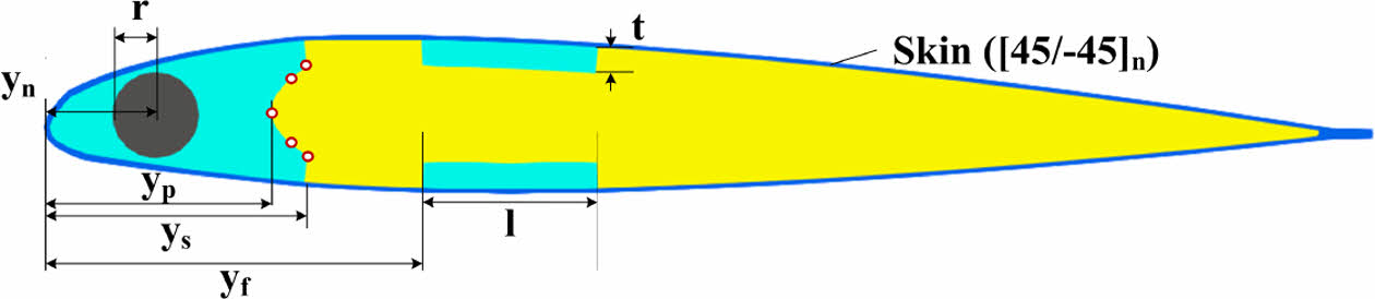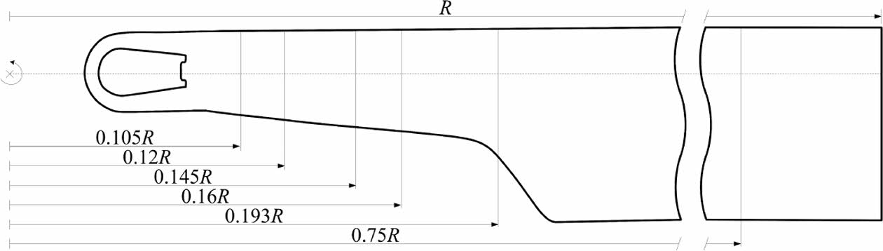 Fig. 5는 에어포일 단면을 예시로 최적화 문제에서 설정한 설계 변수를 보여주고 있다. n은 단면의 외피(skin) 복합재의 적층 수를 의미한다. yp와 ys, yr은 각각 C형 스파(spar)의 제어 점 위치, 스파의 길이, 플랜지의 시작 위치를 의미하며, l은 플랜지의 너비를 의미한다. yn은 무게 추의 위치를, r은 반지름 길이를 의미한다. t는 스파와 플랜지의 두께를 의미한다. 이와 같이 에어포일 영역의 단면에는 8개의 변수가 사용되며, 루트(root) 영역을 포함하여 총 18개의 변수를 설계에 사용했다. 최적화에 활용되는 블레이드는 6개의 단면으로 구성되며, 루트 부분에서 5개, 에어포일 부분의 대표단면 1개를 선정했다. Fig. 6은 HART II 해석 결과[12]를 참고하여 본 연구에서 블레이드 구축을 위해 선정한 단면들의 위치를 로터 반지름을 기준으로 나타냈다.