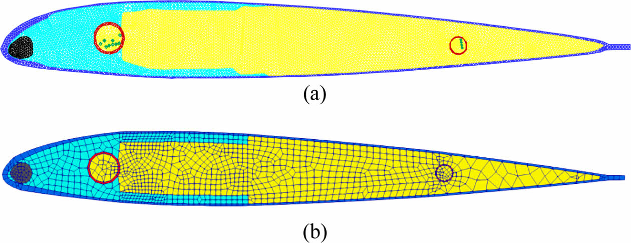 기준 형상과 대응되는 단면을 모델링 하기 위해 Jung등[13]의 연구에서 제시된 균일 부분 단면의 CT 사진(Fig. 1)을 활용했다. 이후 확보한 단면의 형상 정보를 기반으로 유한요소 모델링을 수행했다. Fig. 7은 기준 단면[12]과 새로 생성한 단면의 유한요소 형상을 보여준다. 생성된 단면은 총 1,345개의 2차원 요소로 구성되었다. Ksec2D를 이용해 단면해석을 수행한 결과, 전단중심과 무게중심 위치는 기준 형상의 해석 결과에 비해 최대 2.1%의 오차를 보였다. 또한 단면의 축 강성(EA), 굽힘 강성(EIy, EIZ), 비틀림 강성(GJ)과 같은 강성도를 비교한 결과 최대 4.23%의 오차를 나타냈다. 이상의 결과를 통해 본 연구에서 제시한 단면생성 기법이 유효하게 적용될 수 있음을 확인하였다.