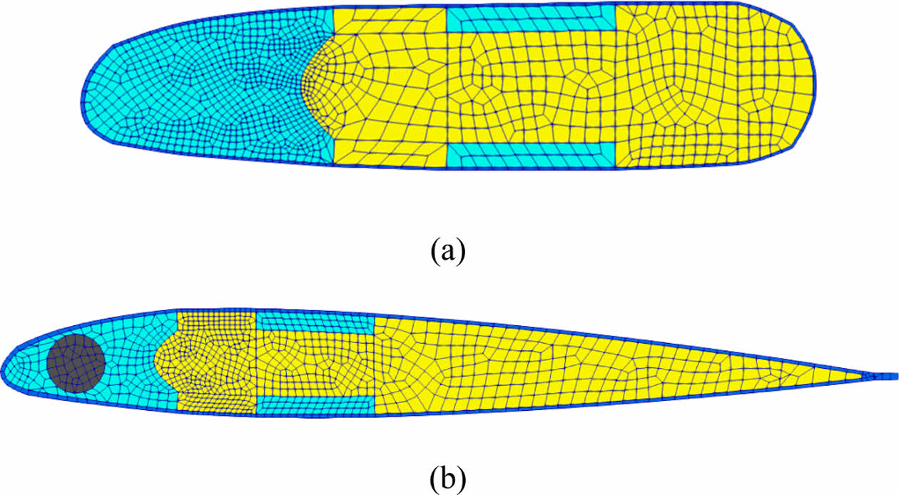 2차원 유한요소기반 단면해석법은 임의의 내부형상 및 재료배치를 갖는 단면 영역을 삼각형 및 사각형 등의 2차원 유한요소를 이용하여 이산화하고, 각각의 요소들을 적분하여 단면물성을 도출하는 방법이다. 임의의 복잡한 형상과 재료영역을 유한요소들로 이산화 하므로, 단면 벽 두께에 대한 특별한 제한 없이 일반적인 블레이드에 적용이 가능하다. 이러한 장점으로 인해, 최근에 수행된 블레이드 최적설계 연구들[5-9]에서는 2차원 단면해석 기법을 널리 활용하는 추세에 있다. 하지만 블레이드 최적설계 과정에서는 반복적인 단면형상 변경으로 인한 유한요소 생성 및 형상 제어에 많은 시간이 소요되며, 내부 배치의 변경에 따른 복잡하고 정교한 알고리즘이 요구되는 것이 단점이 된다. 또한 여러 연구들이[5-10] 각자의 요소생성망 기법들을 이용하여 블레이드의 최적설계연구를 수행하고 있으나, 세부적인 기법들에 대한 적용에 어려움이 있다.