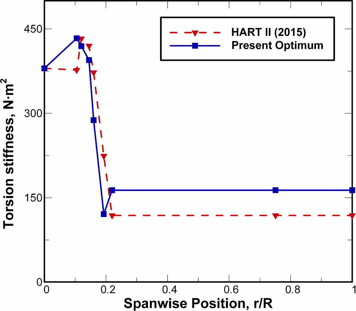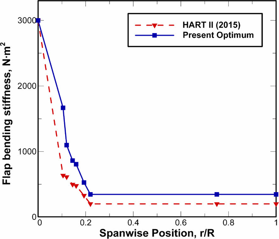 계산의 수렴 검증을 위해 총 5회의 최적설계를 수행했다. 최적화 결과 총 160세대의 계산이 진행되었으며, 기준 형상 대비 블레이드 질량은 1.63% 감소된 2.02 kg으로 계산되었다. Fig. 8은 최적 설계를 통해 도출된 블레이드의 단면 모습이다. 구속조건으로 설정한 균일부의 중심치 ysc, ymc는 각각 0.20c와 0.21c에 위치하여 제약을 충족하였다. 자동회전 관성지수 AI는 기존 블레이드에 비해 1.24배 증가했다. Table 2는 계산을 통해 얻은 블레이드의 1차 고유진동수 ωi 값을 정리한 것이다. 고유진동수 계산 결과 HART II와 비교하여 최대 1.26%의 오차를 보였으며, 이를 통해 블레이드의 고유한 특성이 유지되었음을 알 수 있다. 또한 공칭로터 속도 비행에서의 고유진동수 해석을 통해 공진회피의 개선 여부를 확인하였다. 기존의 블레이드는 로터 회전속도의 정수 배 값 N에서 최소 ±0.08/rev의 차이로 회전 고유진동수를 얻었다. 최적화 수행 결과, 공진회피 대상 모드의 고유진동수 값이 N과 ±0.15/rev 이상의 차이를 갖는 것을 확인하였다. Fig. 9와 10은 확보한 블레이드 전체의 굽힘 비틀림 강성 분포를 HART II 블레이드의 해석 결과[12]와 비교하여 나타낸 것이다. 기존 블레이드와 비교하여 전반적으로 유사한 분포를 보이나 균일부의 강성치가 최대 71.8% 증가함을 보여주고 있다.