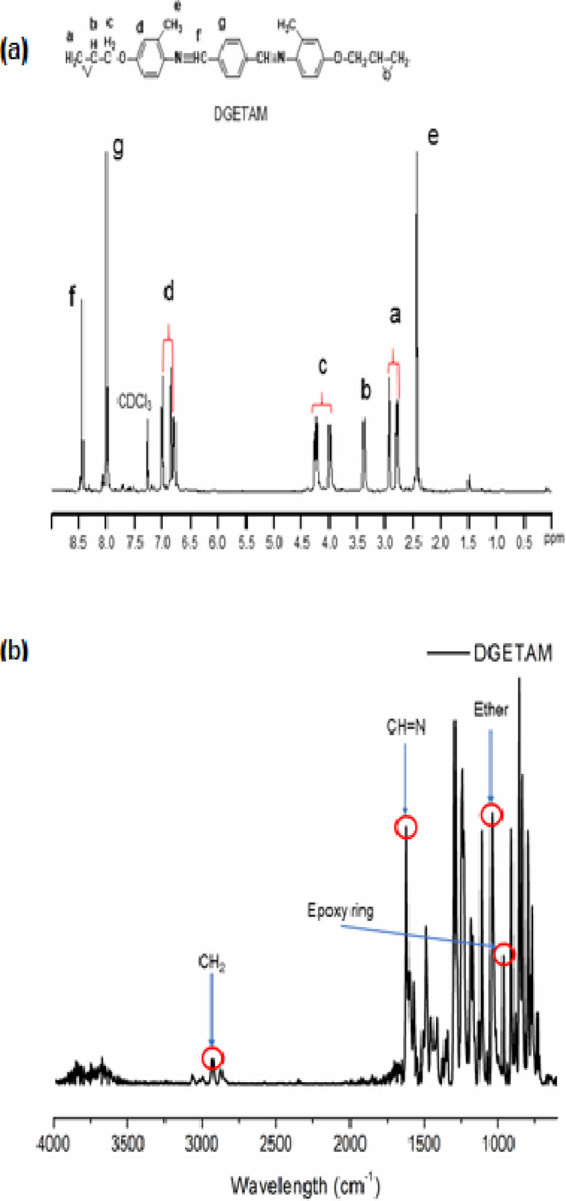Fig. 1 DGETAM (a) 1H-NMR and (b) FT-IR data |