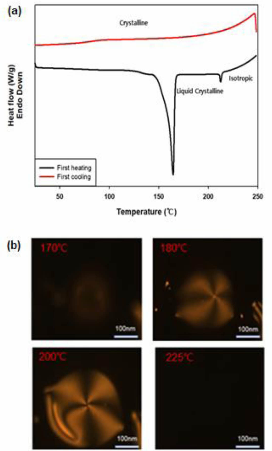 합성한 DGETAM의 액정의 형성을 확인하기 위해 DSC와 POM으로 액정이 형성되는 온도 범위와 상의 형태를 확인하였다. DSC 분석 결과 Fig. 2(a)와 같은 데이터를 얻을 수 있었다. 아래쪽 그래프에 보여진 바와 같이 가열 시 2개의 흡열 피크가 163.9oC, 212.3oC에서 나타났으며, 가열 시 최초에 생기는 큰 피크가 액정의 형성을 의미하며, 작은 피크가 액정의 소멸, 등방성을 나타내는 것을 의미한다. 위쪽 그래프에 표기된 바와 같이 냉각 시에는 245.9oC에서 발열 피크가 나타났다. 가열 시에만 액정이 나타나는 것으로 보아 단방성(monotropic) 액정임을 확인할 수 있다. POM에 hot-stage를 장착 후 10oC/min의 승온 속도로 가열한 결과 170-224oC에서 Fig. 2(b)와 같이 birefringence 무늬를 확인할 수 있었고 십자 형태의 Schlierene 무늬가 나타나는 것으로 보아 DGETAM은 네마틱 액정을 형성하는 것을 알 수 있다[35,36].
