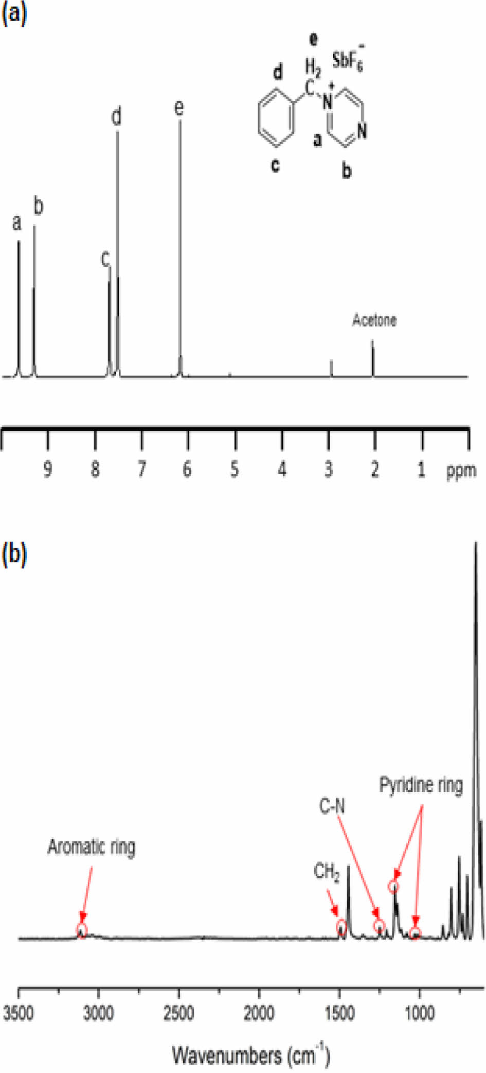 Pyrazine 1.6 g, benzyl bromide 7.3 g를 500 ml 3구 플라스크에 넣고 상온에서 24시간 마그네틱 바를 사용하여 교반시킨다. 24시간 이후에 생성된 benzylpyrizinium bromide salt를 증류수에 녹인 후, 용액에 5.17 g의 NaSbF6를 첨가하고 마그네틱 바를 사용해 교반을 시켜 흰색 고체를 얻는다. 생성된 고체는 methyl alcohol을 사용하여 수세 및 재결정 후, 12시간 이상 진공 건조시켜 용매를 제거한다[33,34].