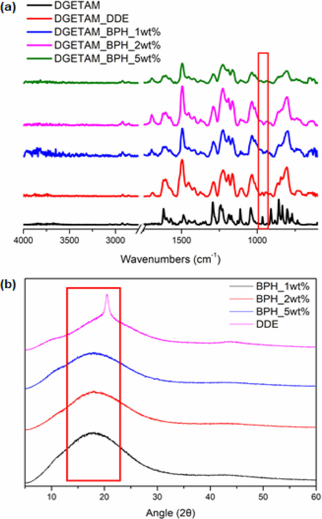 Fig. 4 (a) FT-IR data of DGETAM, DDE, BPH 1,2,5 wt%, (b) XRD data of DGETAM_BPH and DDE |