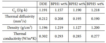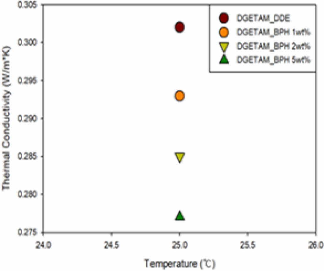 에폭시 필름의 열전도도를 분석하기 위해 LFA를 사용하였다. 열전도도는 식 (1)을 사용하여 구할 수 있고 Fig. 5에 나타내었다. 열전도도는 DDE를 사용한 경우, BPH를 사용한 경우 보다 높게 나타났으며, BPH 함량의 증가에 따라 열전도도가 떨어지는 것을 확인 할 수 있었다. 이는 Table 2의 열확산 계수가 BPH의 함량 증가에 따라 감소하는 것은, 액정의 형성에 따라 포논의 산란이 감소된다는 기존 연구와 일치하는 결과로, DGETAM_BPH 시스템에서 액정 구조 형성이 제대로 이뤄지지 않아 아민계 경화제를 사용했을 때 보다 열전도도가 감소한 것으로 보인다[37,38].