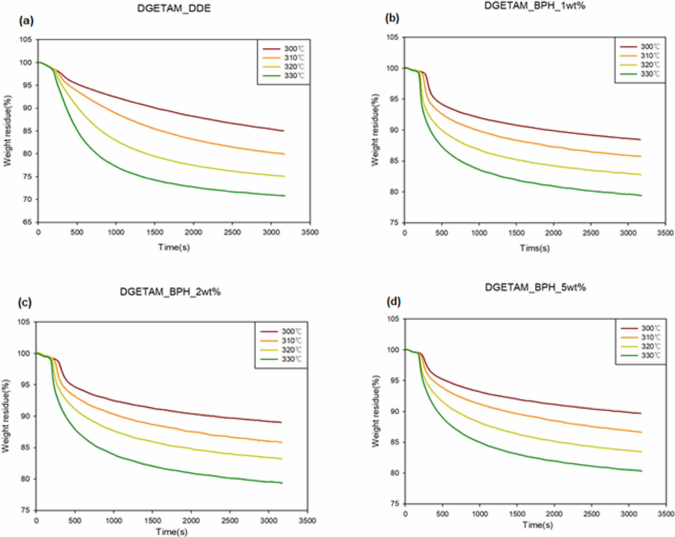 Fig. 6 Isothermal TGA graph (a)DDE, (b) BPH 1 wt%, (c) BPH 2 wt%, (d) BPH 5 wt% |