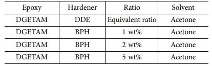DGETAM의 경화제는 합성한 BPH 이외에 아민계 경화제인 DDE를 사용하였다. 아민계 경화제인 DDE는 반응할 수 있는 활성 수소가 말단에 4개 존재하고, DGETAM은 말단에 에폭시가 2개 존재하기 때문에 당량비는 1:2로 설정하였고, BPH는 무게비로 1, 2, 5 wt%를 사용하였다. 모든 샘플은 DGETAM 2 g을 기준으로 넣고, 용매로 acetone을 사용하여 30분 가량 소니케이터를 사용해 분산시켜준다. 분산된 용액을 테플론 디쉬에 담고 후드 안에서 12시간 이상 자연 건조하여 acetone을 제거한다. Acetone 제거 후, 막자와 막자사발을 사용하여 곱게 갈아준 후 hot press를 사용하여 180oC에서 필름 형태로 Table 1 조건으로 샘플을 제작한다.