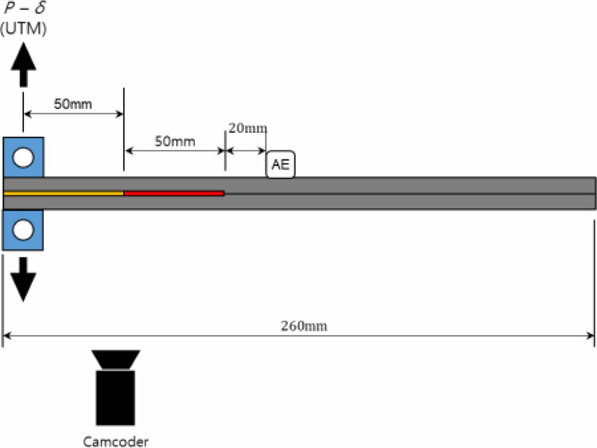 DCB 시험은 ASTM 5528에 따라 수행되었다. Fig. 1은 DCB 시험의 개략도이다. 시험은 INSTRON 5900R을 사용하여 수행되었고 cross-head의 변위 속도가 1 mm/min인 변위 제어 조건에서 수행되었으며, 하중 및 변위 데이터는 10 Hz의 속도로 기록되었다. 인공 결함이 삽입된 시편에 하중을 부과하여 초기 균열(a0)을 55 mm 진전시킨 후 하중을 제거하였다. 이후 다시 하중을 부과하였고 균열 선단 위치가 100 mm지점에서 시험이 종료되었다. 균열 선단의 위치를 기록하기 위하여 시편의 측면부에 캠코더를 설치하였고, 하중 작용점으로부터 120 mm 떨어진 지점에 음향 방출 센서를 DCB 시편 윗면에 양면테이프를 사용하여 부착하였다.