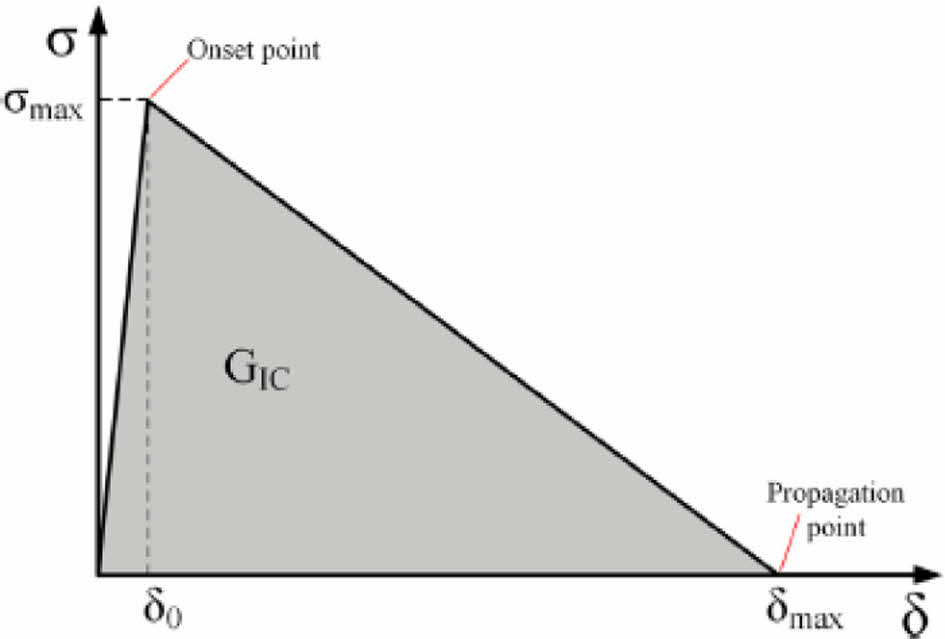 응집 영역 모델은 복합재 적층판의 Mode I 균열 성장을 모사하는 방법 중에 가장 효과적이라고 알려져 있다[8]. Fig. 2는 일반적인 bi-linear 응집 영역 요소이다. 응집 영역 요소는 파괴 인성(G0), 초기 계면 강성(K0) 및 계면 강도(σ0)로 구성된다. 하중이 증가함에 따라 응집 영역 요소가 받는 응력은 초기 계면 강성(K0)을 따라 증가하며 요소의 파괴는 발생하지 않는다. 이후, 응집 영역 요소가 받는 응력이 계면 강도(σ0)에 이르면 응집 영역 요소가 손상되기 시작하고 계면 강성은 감소한다. 최종적으로 응집 영역 요소의 손상과정에서 소실된 에너지가 파괴 인성 값(GIC)과 같아지는 시점에서 응집 영역 요소의 파괴가 발생한다.