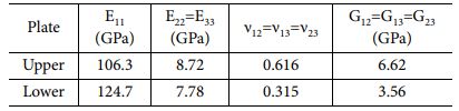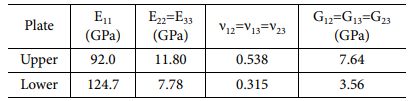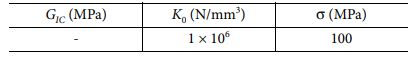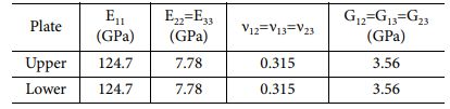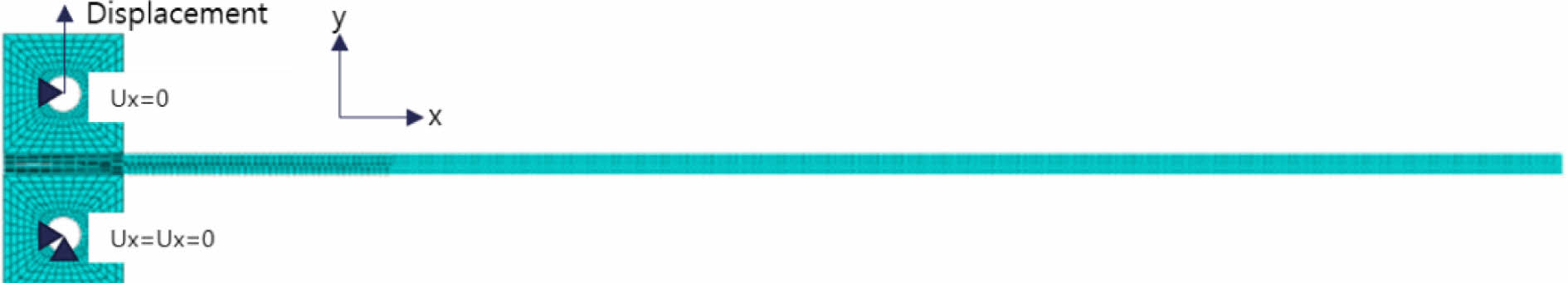 여기서 n12, n21는 포아송 비, t는 시편의 절반 두께이다. Table 5는 응집 영역 요소의 입력 매개변수로 GIC 값은 균열 길이에 따라 변화하는 값을 적용하였기 때문에 ‘-’로 입력하였다. 이에 대한 결과는 결과 및 토론에서 제시하였다.
