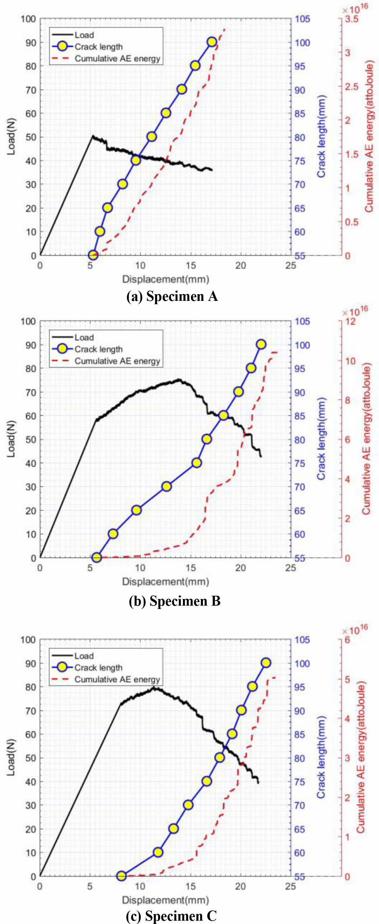 4.1.1 하중, 균열 길이 및 누적 음향 방출 에너지-변위 곡선