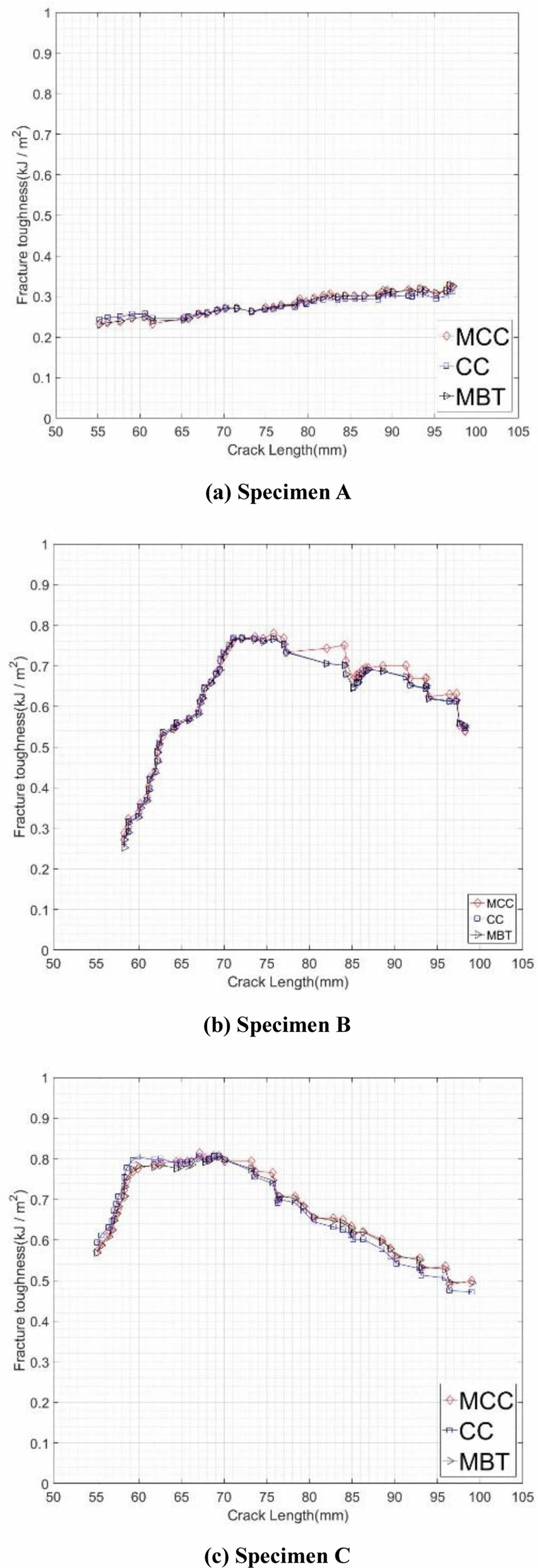 Specimen B와 specimen C와 같은 비대칭 적층판의 경우, Angle ply층으로 균열이 전이되는 현상이 발생하고 이 현상은 가교 현상의 원인으로 파괴 인성 증가로 이어진다. 이로 인하여 specimen B와 specimen C는 specimen A에 비하여 높은 파괴 인성 값을 보였으며, 유사한 최대 파괴 인성 값을 보였다. 하지만 specimen B가 specimen C보다 낮은 초기 파괴 인성 값을 보였으며, 반대로 균열이 진전될수록 specimen B는 specimen C에 비하여 상대적으로 높은 파괴 인성 값을 보였다.