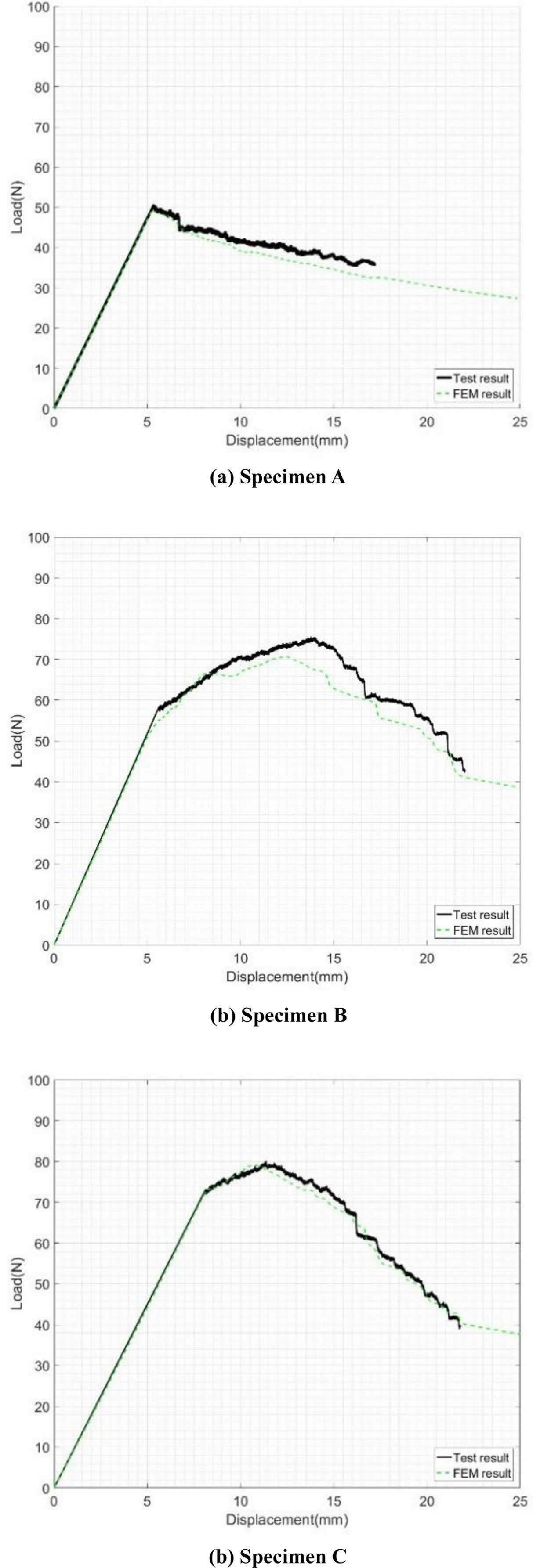 Fig. 4는 Specimen A, B 및 C에 대하여 각각의 하중-변위, 균열 길이-변위 및 누적 음향 방출 에너지-변위 곡선 결과를 보여준다. 모든 균열 길이는 하중을 부여하는 지점을 기준으로 55 mm부터 100 mm까지 5 mm 간격으로 측정되었다. Specimen A의 경우, 균열 개시 이후 하중이 점진적으로 감소하는 경향을 보였다. 반대로 specimen B와 specimen C의 경우 균열 개시 이후 하중이 계속 증가하다가 특정 변위 이후 하중이 점진적으로 감소하는 경향을 보였다. 이는 균열 개시 이후 섬유 가교(Fiber bridging) 현상으로 인하여 균열 진전 속도가 지연되고 하중이 증가하다 섬유 가교의 섬유가 시편이 떨어져나가면서 하중이 점진적으로 감소하고 균열 진전 속도가 빨리지는 경향을 보였다.