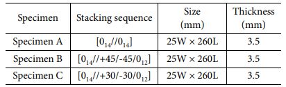 본 논문에서는 SK 케미칼㈜의 USN 125 A(탄소/에폭시 일방향 프리프레그)를 사용하여 시편을 제작하였다. 모든 시편은 Hand lay-up으로 적층되었고 시편의 중앙 면에는 두께 0.013 mm의 폴리이미드 필름(인공 결함)을 삽입하여 오토클레이브를 사용하여 성형하였다. Table 1은 시편의 사양이며, '//'은 인공 결함이 삽입된 층을 의미한다. 계면 사이의 상대적인 섬유 각도가 파괴 인성에 미치는 영향을 확인하기 위하여 계면의 각도가 0o, 30o 및 45o가 되도록 시편을 제작하였다. 균열 길이를 확인하기 위하여 시편의 측면부에 노란색 물감을 이용하여 코팅하였고 1 mm 간격으로 눈금을 표시하였다.