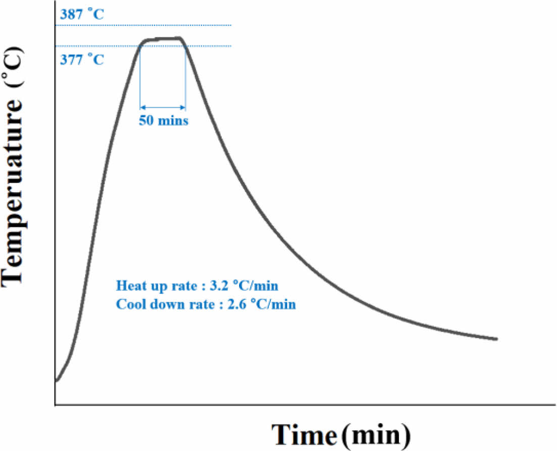 자재 전체에 일정한 열을 부여하여, 온도를 모재인 CF/PEKK의 녹는점인 337°C 이상까지 안정적으로 상승시킴으로써 자재 내 온도 편차를 최소화할 수 있는 고온 오븐 접합 공정을 이용하였다. 열가소성 고분자 가열하여 점성을 증가시킨 후 물리적으로 고분자 사슬을 결합하여 접합하는 융합 접합과 모재 사이에 접착제를 위치한 후 가열하여 접합하는 방법인 접착제 접합을 고온 오븐 접합 공정을 통해 진행하였다. 융합 접합, PEEK 접착제 접합, PEI 접착제 접합된 세 종류의 CF/PEKK 라미나(lamina)를 제작하였다. Fig. 1에 표시된 경화 사이클을 적용하여, Fig. 2에 나타난 형태로 CF/PEKK 라미나를 접합하여 실험을 진행하였다.