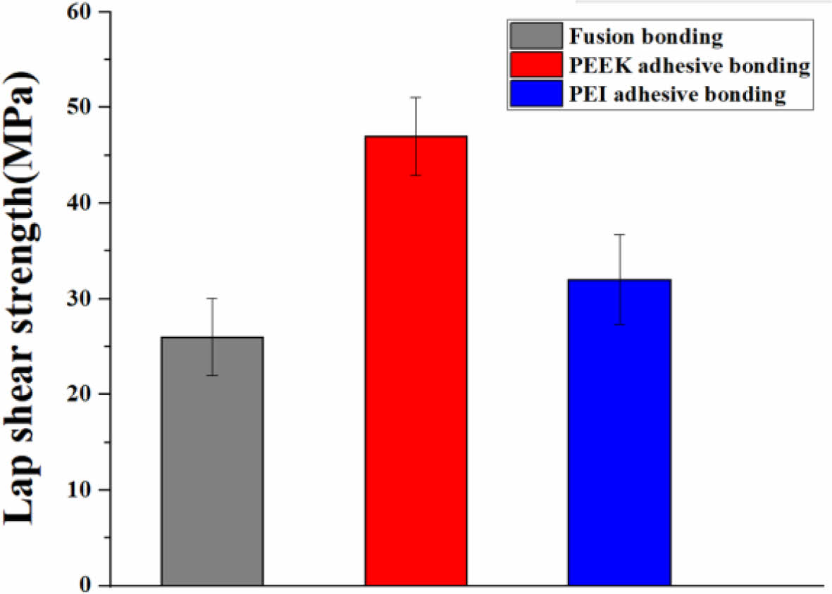 Fig. 4 Lap shear strengths for fusion bonded, PEEK and PEI adhesive bonded CF/PEKK lamina |