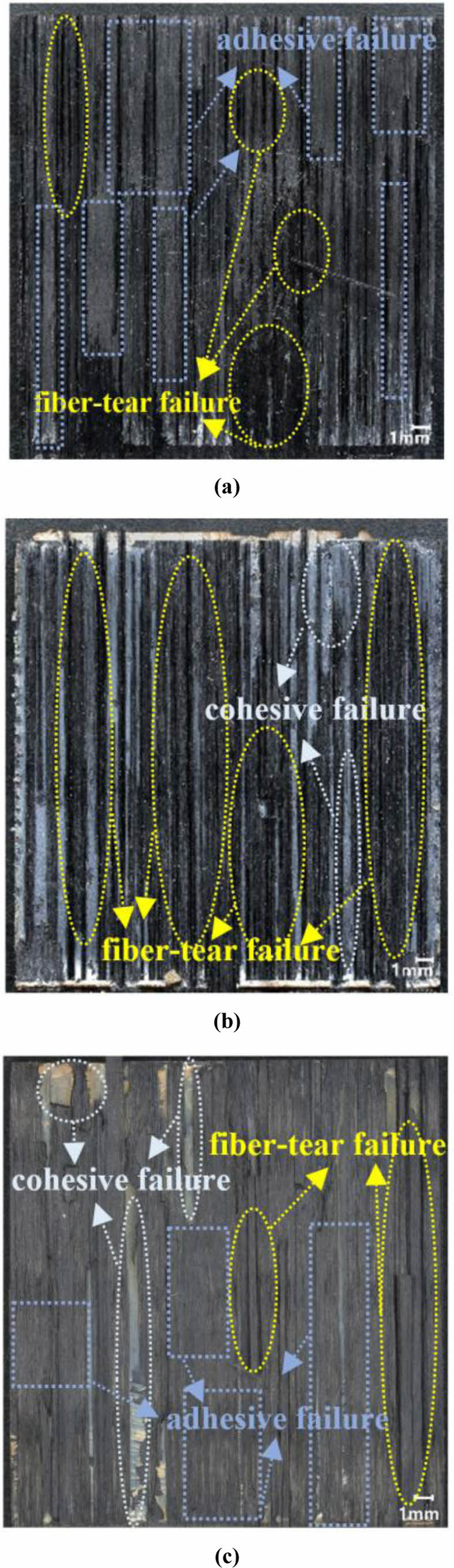 고온 오븐 접합 공정을 통해 융합 접합, PEEK 접착제 접합, PEI 접착제 접합된 CF/PEKK 라미나의 lap 전단 강도(lap shear stength, LSS)를 측정하여 접착 강도를 비교하였다. lap 전단 강도 시험은 기계식 만능재료시험기(Kyung Do Precision KDMT-156)를 이용해 진행되었으며, ASTM 5868 규격을 준용하였다. 디지털 광학 현미경(digital optical microscope, KEYENCE VHX-7000)을 이용한 파단면 관찰을 통해서 Fig. 3와 같이 파괴 양상을 분류하였다[24]. 또한 주사 전자 현미경(scanning electron microscope, TESCAN MIRA)을 이용하여 파단면의 수지 부분을 관찰하여 인터페이즈의 결합력을 판단하고 비교하였다.