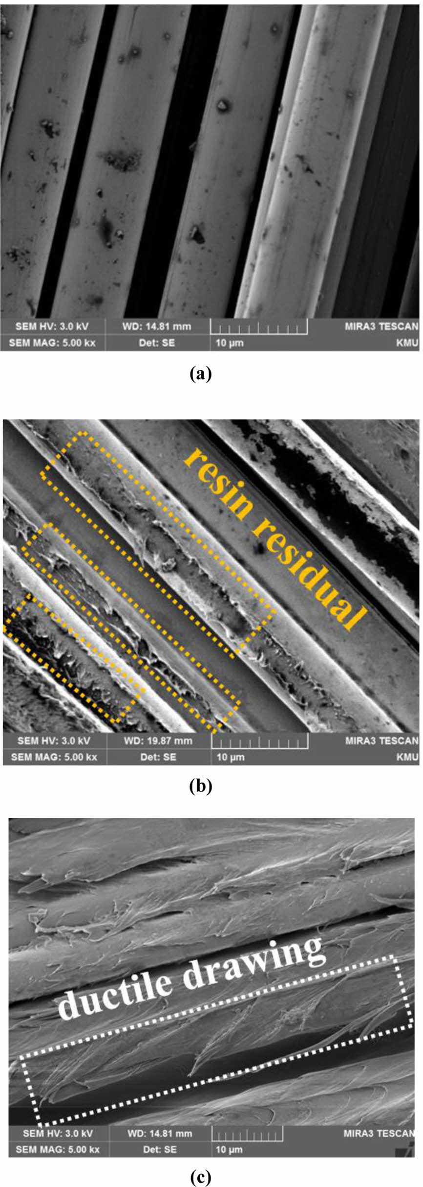 주사 전자 현미경을 사용하여 융합 접합, PEEK 접착제 접합, PEI 접착제 접합된 CF/PEKK 라미나의 lap 전단 시험 후 파단면을 5000배율로 촬영한 사진을 Fig. 6에 나타내었다. 접착제 접합에 의해 형성된 인터페이즈와 섬유의 결합력을 판단하기 위하여 파단면의 섬유 부분에 대한 관찰을 진행하였다. 융합 접합으로 접합된 CF/PEKK 라미나의 경우, 섬유와 수지가 잔여물을 남기지 않고 분리되는 양상의 파괴가 발생하였다. 그리고 접착제를 사용하여 접합한 경우 섬유에 수지 잔여물(resin residual)이 부착된 것을 관찰하였다. PEEK 접착제 접합의 경우 비교적 적은 양의 수지 잔여물이 부착된 파괴 양상이 관찰되었으며, PEI의 접착제 접합의 경우 비교적 많은 양의 수지 잔여물이 덕타일 드로잉(ductile drawing)의 형태를 띄며 섬유에 부착된 형태의 파괴 양상이 관찰되었다. 이와 같이 PEI 접착제 접합의 경우 덕타일 드로잉 현상이 발생한 것을 통해서 PEEK 접착제를 사용하여 CF/PEKK 라미나를 접합했을 때 보다 더 낮은 강도의 인터페이즈가 모재와 접착제 사이에 형성되었음을 알 수 있었다[27,28].