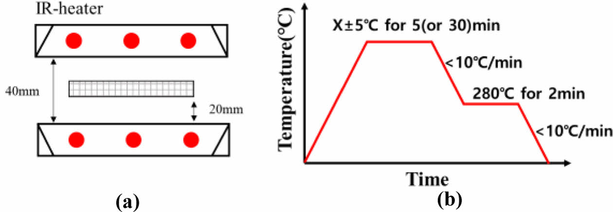 본 연구에서는 Solvay 社의 APC(PEKK-FC) 모델로 PEKK와 Carbon fiber가 혼합된 prepreg를 [45/0/-45/90]2s 패턴으로 적층하여 진공오븐성형으로 중간재(Blank) 제작하였으며, Fig. 1 과 Table 1에 PEKK의 분자구조와 PEKK 원자재 및 제작된 중간재의 열 특성을 각각 나타내었다. Fig. 2는 근적외선 가열 모식도를 나타냈으며, Table 2는 근적외선 가열조건으로 제조사 Solvay 社의 성형온도 및 열화가 진행되는 온도를 기준으로 성형온도 범위를 설정하였다[7,10]. 열화에 따른 결정구조 변화를 확인하기 위하여 전체 공정 중 가열 단계만 진행하였으며, 냉각과정에서 무정형 구조의 성장을 최소화하기 위하여 10oC/min 이하의 냉각속도를 유지하며, 280oC 위치에서 2분간 유지하였다.
