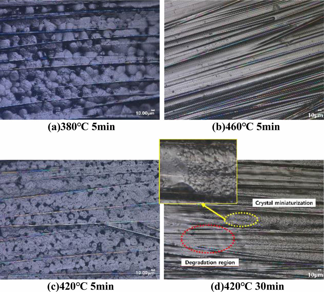 Fig. 3은 근적외선 고속가열 시 CF/PEKK의 표면의 PEKK 구결정 상태를 광학현미경을 통해 관찰한 결과이다. Fig. 3(a) 380oC 가열 시 표면의 PEKK는 조대한 구결정으로 구성되어 있으며, Fig. 3(c) 420oC 5분 가열에서 구결정의 크기가 작아지며 밀도가 높아졌다. Fig. 3(d) 가열 시간이 길어질수록 점차 구결정이 작아지며 결정 경계가 소멸하며, 넓은 범위에서 부분적으로 매끄러운 표면인 열화 영역(Degradation region)이 발생하였다.