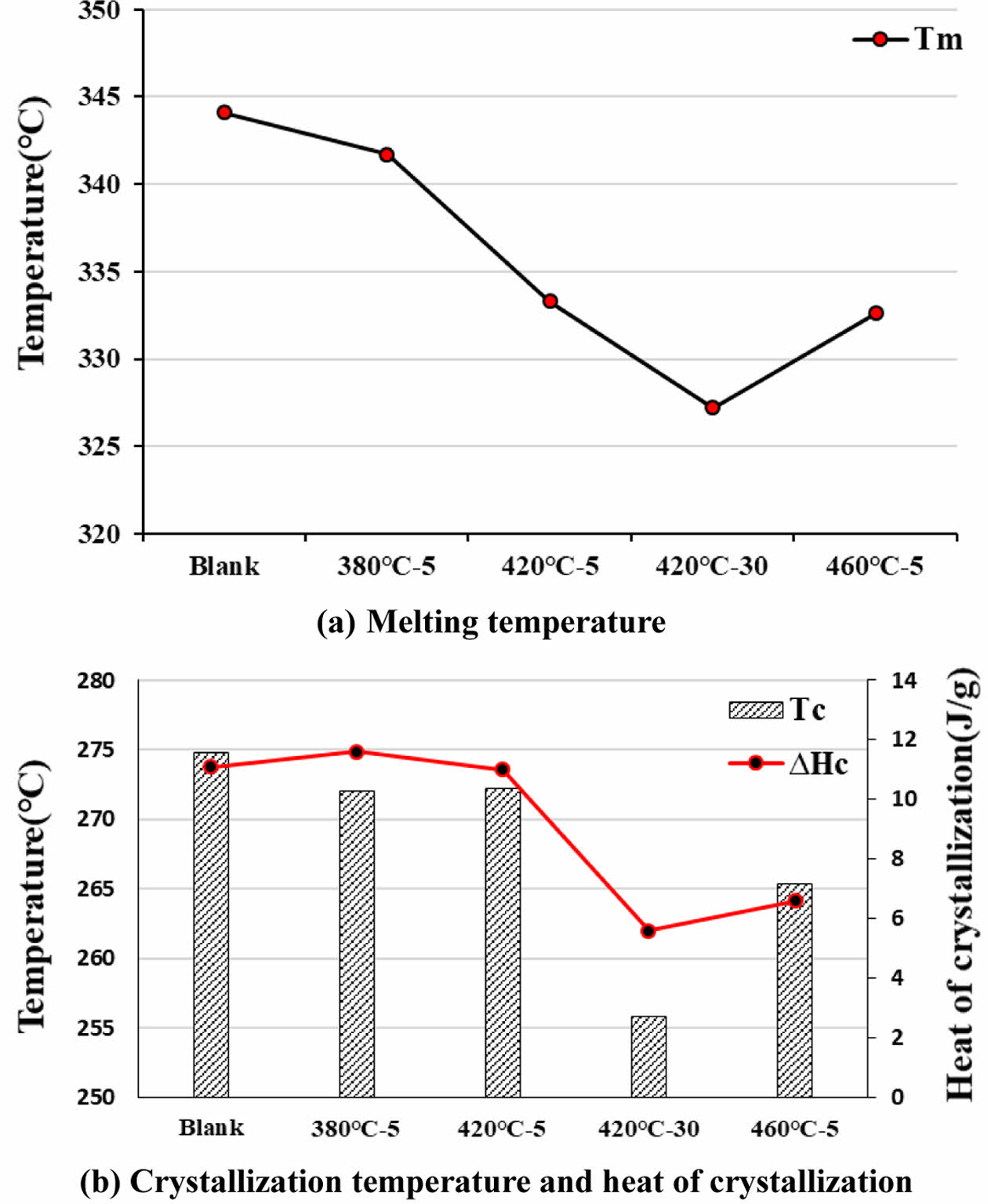 결정화온도, 발열량은 PEKK의 결정을 이루는 사슬의 상태와 관계가 있는 요인으로 공통적으로 420oC 30분 가열조건부터 감소하는 경향이 관찰되었으며, 이는 결정이 성장하기 위한 에너지 및 결정을 이루는 사슬의 감소를 의미한다[10]. 특히, Table 4에서 460oC 30분 가열에서는 PEKK의 열특성이 모두 소멸된 것을 확인하였으며, 이는 PEKK에 가역적 반응을 할 수 있는 결정들이 모두 소실되어 비가역적인 특징을 가지게 된 것을 판단된다. 반면 460oC 30분 가열 시편의 내부에서 열특성이 검출되었으며, 이는 짧은 파장으로 소재 내부까지 침투하여 가열하는 근적외선 가열방식에도 불구하고 산소와 직접적으로 노출되어 있는 표면에서 내부에 비해 급격한 열화가 진행되고 표면에 열화된 PEKK가 산소를 차단하여 내부 열화를 지연하는 것으로 보여진다[10].