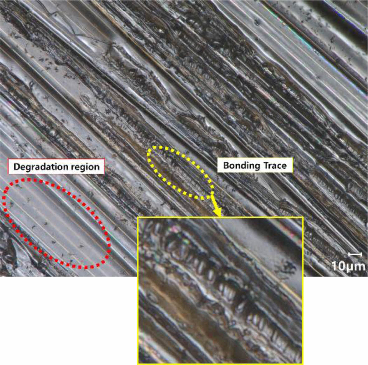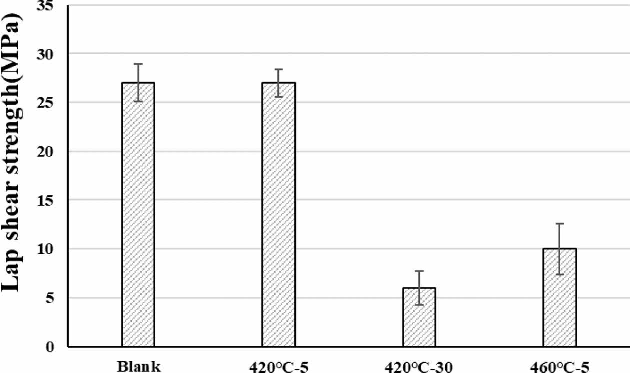 Fig. 5는 근적외선에 의해 열화된 표면에서의 PEKK의 재용융특성을 확인하기 위하여 랩전단시험을 진행하였으며, Fig. 3에서의 소형화된 결정 및 열화 영역을 가지는 420oC 30분, 460oC 가열 시편에서 낮은 접합강도가 관찰되었다. 접합파괴면에서(Fig. 6) 진공오븐성형 중 재용융을 통한 결합은 일부에서만 관찰되고 대부분 열화 영역이 관찰되었다. 열화영역에서 재용융에 의한 결합 흔적이 관찰되지 않은 것으로 보아 해당 표면은 용융 특성이 소실된 것으로 사료된다.