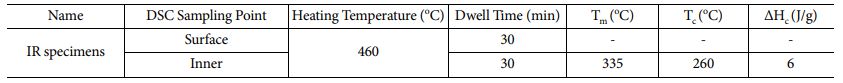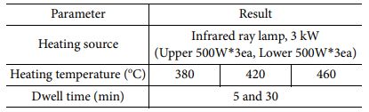 형태학적 분석은 광학현미경을 통해 확인하였으며, 가열 후 표면에 존재하는 결정의 형상 및 변화를 분석하였다. 열 특성은 시차 주사 열량측정법(Differential Scanning Calorimetry: DSC)을 통해 분석하였으며, 시험은 30-400oC 온도 범위, 20oC/min 승온 및 냉각속도, 아르곤 분위기에서 진행하였다. 열화에 의한 수지의 특성 변화를 랩전단강도(Lap shear strength: LSS) 시험을 통해 확인하였으며, 시편제작은 근적외선 고속가열 후 진공오븐성형을 통해 접합하여 진행하였다.