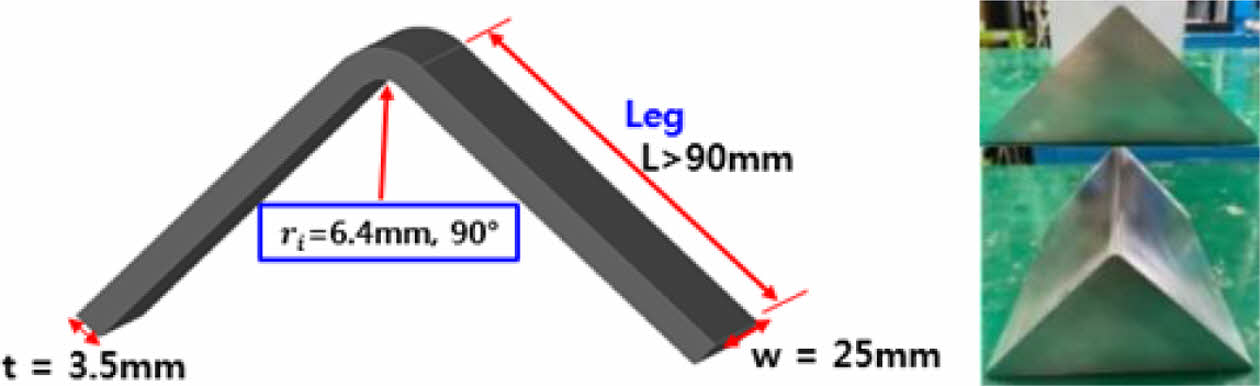 프리폼은 제직장비의 특성상 매우 두껍게 제조하기는 어렵기 때문에 4점 굽힘 시험(4-Point Bending Test) 시험편의 제조 및 시험을 통하여 면 외 방향 인장강도를 이론적으로 계산하고자 하였다. 시험편은 ASTM D6415를 참고하였으며 규격에 따라 시험편의 곡률부는 Fig. 2와 같이 내경 6.4 mm, 빔 직선부(Loading Leg, L) 90 mm 이상, 직선부 사이의 각도 90o, 너비(w) 25 mm, 두께(t) 3.35 mm가 되도록 준비하였다. 시험편 제조에는 진공 보조 수지 이송 성형(Vacuum Assisted Resin Transfer Molding, VARTM) 공정을 사용하였으며, 특수 제작된 성형 몰드에 섬유를 적층한 후 이중 진공백 방법을 이용하여 수지를 주입하였다.