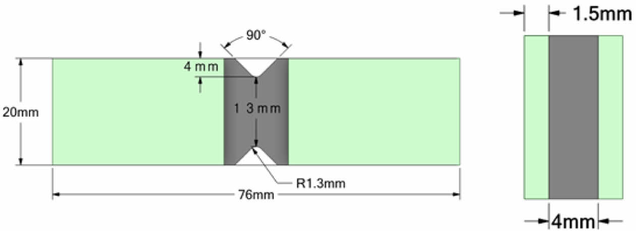 면 외 방향 전단탄성계수(G13, G23) 측정을 위한 V-Notch 전단시험(V-Notch Shear Test) 시험편의 경우 ASTM D5379를 참조하였다. 시험편의 개략도는 Fig. 3과 같이 규격에 따라 가로 76 mm, 높이 20 mm, 두께 4 mm 치수로 준비하였다. 노치의 각도는 90°, 반지름은 1.3 mm이며 노치와 노치 사이의 거리는 13 mm이다. 시험편에 부착한 탭의 경우 규격을 참고하여 시험편의 총 두께를 증가시켜 시험편이 그립에 의한 압축 파손이나 비틀림을 방지하기 위해 부착하였다.