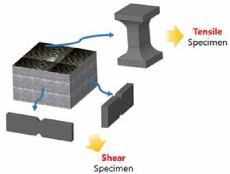 Fig. 4 Extraction of the tensile and shear test samples from CFRP which made of 3D preform |