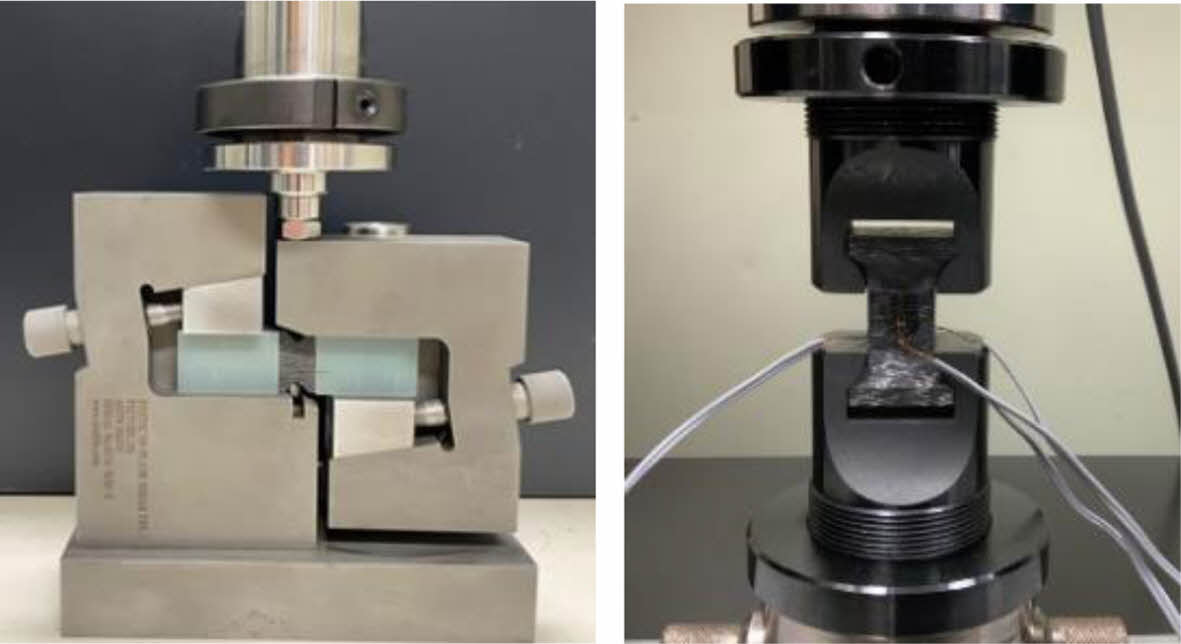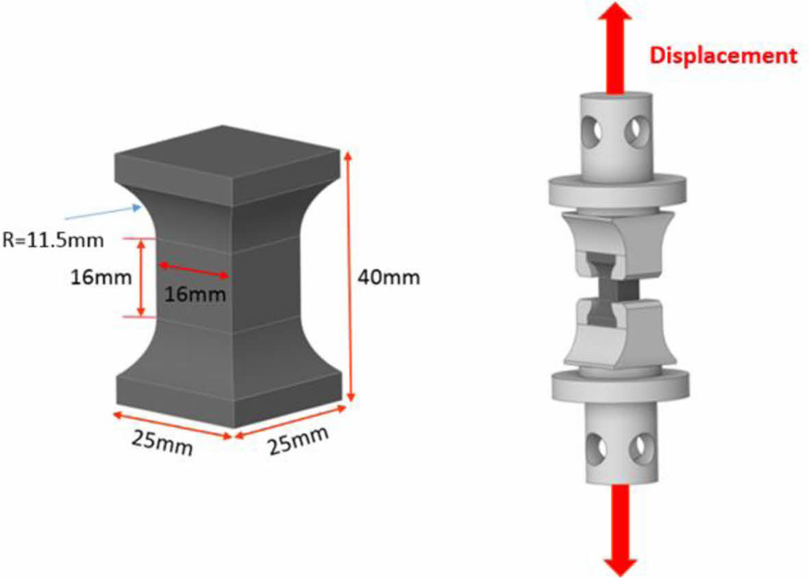 면 외 방향 강도 및 탄성계수(E33) 측정을 위한 인장 시편은 ASTM D7291을 참고하여 제조하였다. 시험편 및 시험용 치구의 개략도는 Fig. 5에 나타내었다. 섬유를 적층하여 가공한 시험편으로 시험편의 파손이 16 mm × 16 mm 내의 일정 범위 안에서 일어나도록 가공하였다. 시험편의 가로 세로 길이는 25 mm이며 높이는 40 mm이다. 시험편의 모든 면의 곡률부는 반지름(R)은 11.5 mm로 가공하였으며 Gauge cross section은 가로16 mm, 세로 16 mm의 단면을 주어 가공하였다.