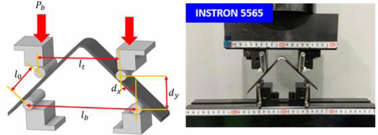 4점 굽힘 핀의 직경(D)은 모두 10 mm이다. dx와 dy는 상부, 하부 핀의 중심에서 수평, 수직 거리이며 dx는 12.5 mm, dx는 25.3 mm이다. lt는 상부 핀 중심 간 거리로 75 mm이며 lb는 하부 핀 중심 간 거리로 100 mm이다. l0는 시편 직선부와 상부 하부 핀 중심의 거리로 30.4 mm이다. pb는 하나의 핀에 적용되는 하중으로 적용 하중의 절반을 사용하였다.