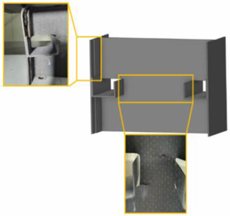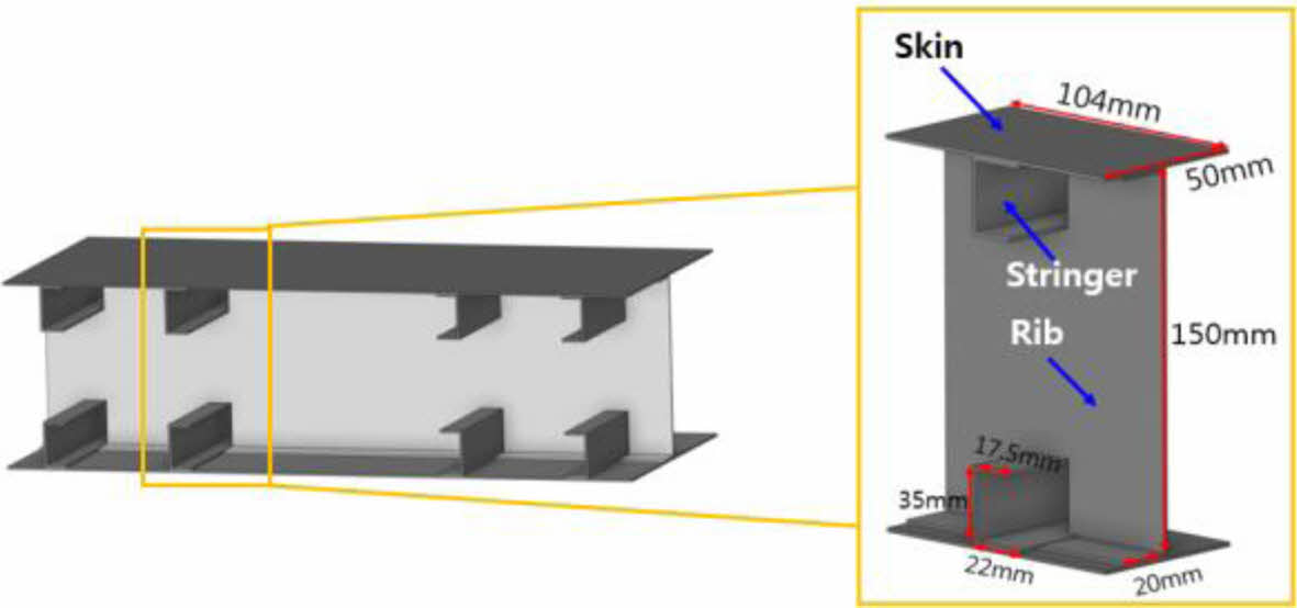 본 연구에서 항공기 날개 내부 구조체의 파손거동을 조사하기 위하여 제조한 단위구조체의 형상 및 치수는 Fig. 8과 같다. 여기서 단위구조체란 항공기 날개 내부의 반복되는 구조 중 최소 단위가 되는 요소를 말한다. 본 연구에서는 날개의 일부분인 상부 스킨과 하부 스킨 사이에 2개의 스트링거와 1개의 리브가 있는 항공기 날개 구조의 반복되는 부분을 단위구조체로 선정하여 시험을 진행하였다.